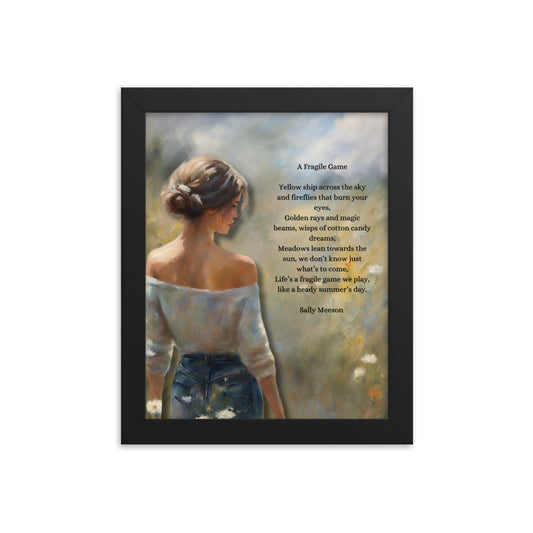 'A Fragile Game' framed photo paper poster with impressionist oil style artwork and original poem by writer Sally Meeson
