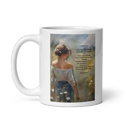 'A Fragile Game' white glossy mug with impressionist style artwork and original poem by writer Sally Meeson