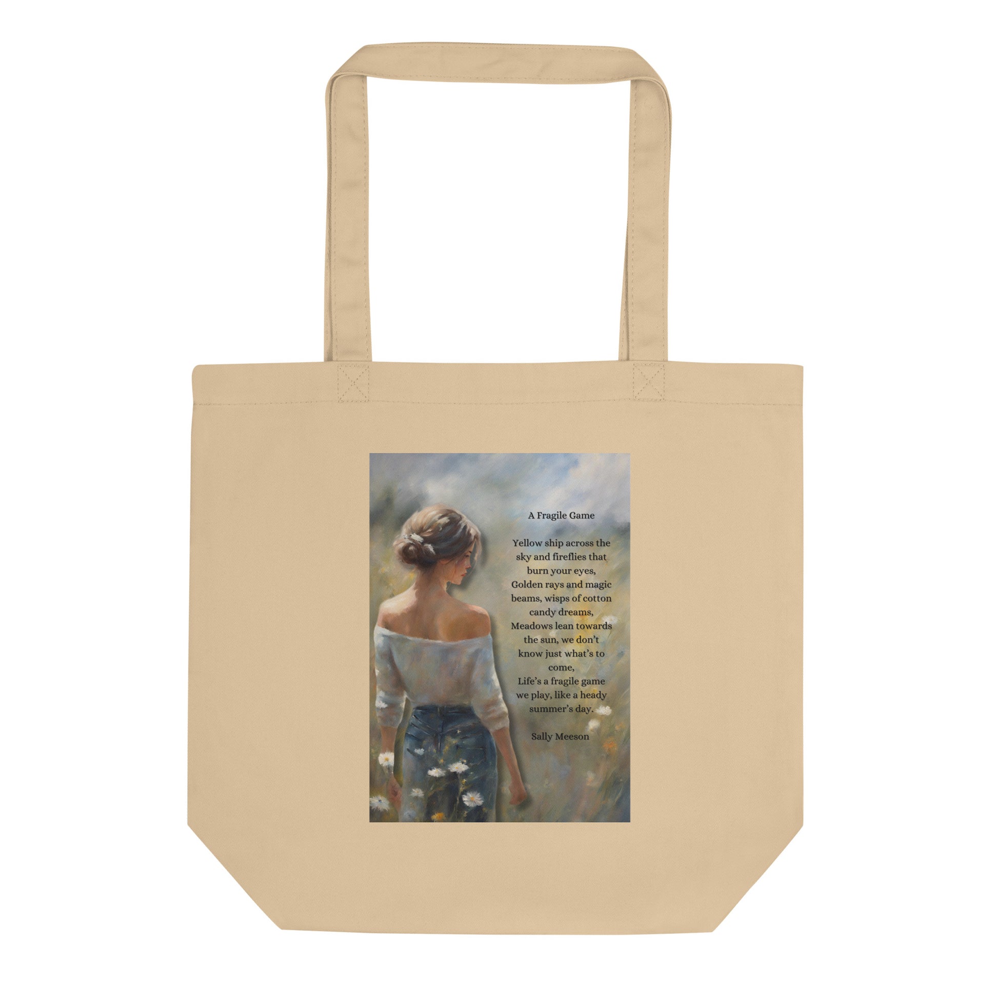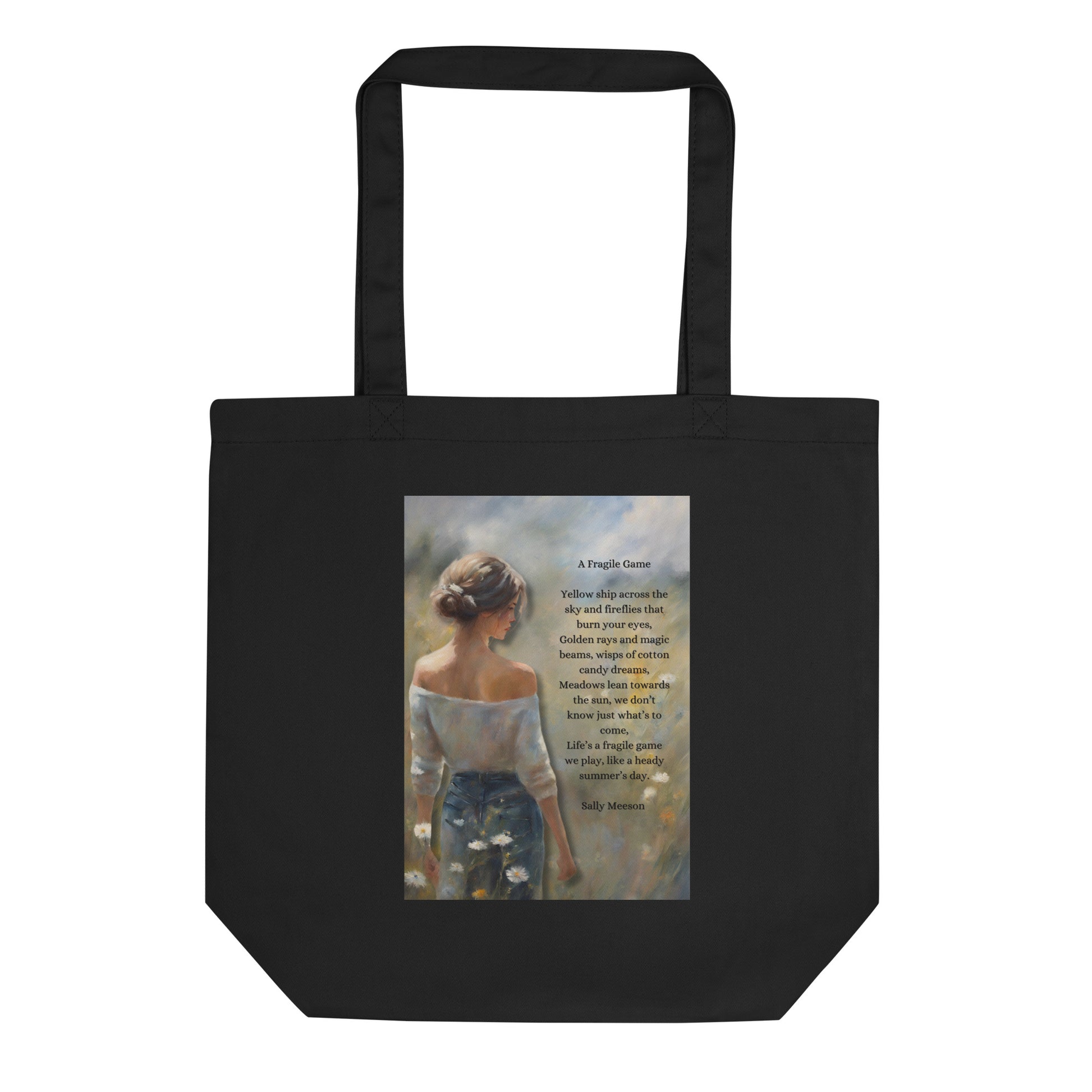 'A Fragile Game' eco tote bag with impressionist style artwork and original poem by writer Sally Meeson