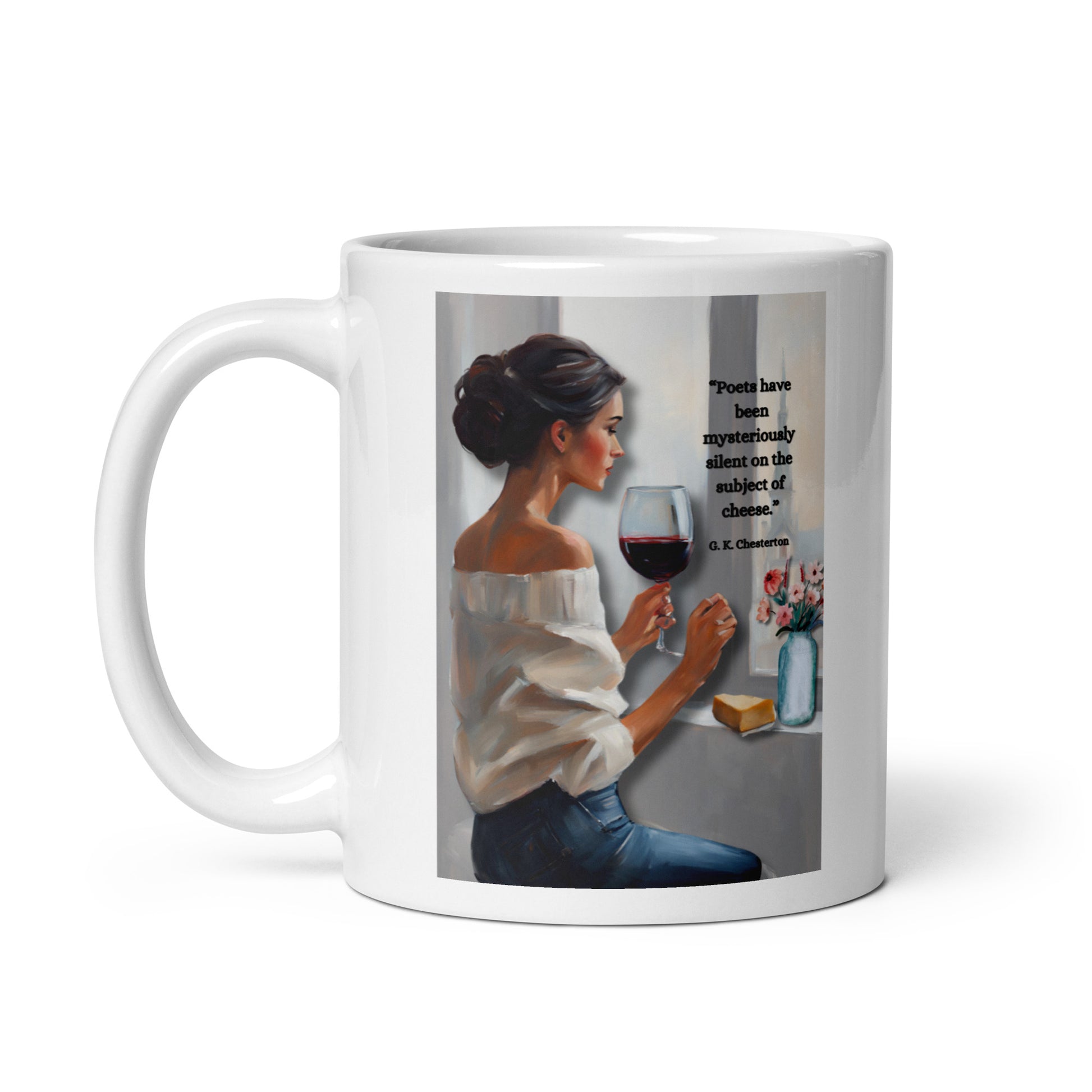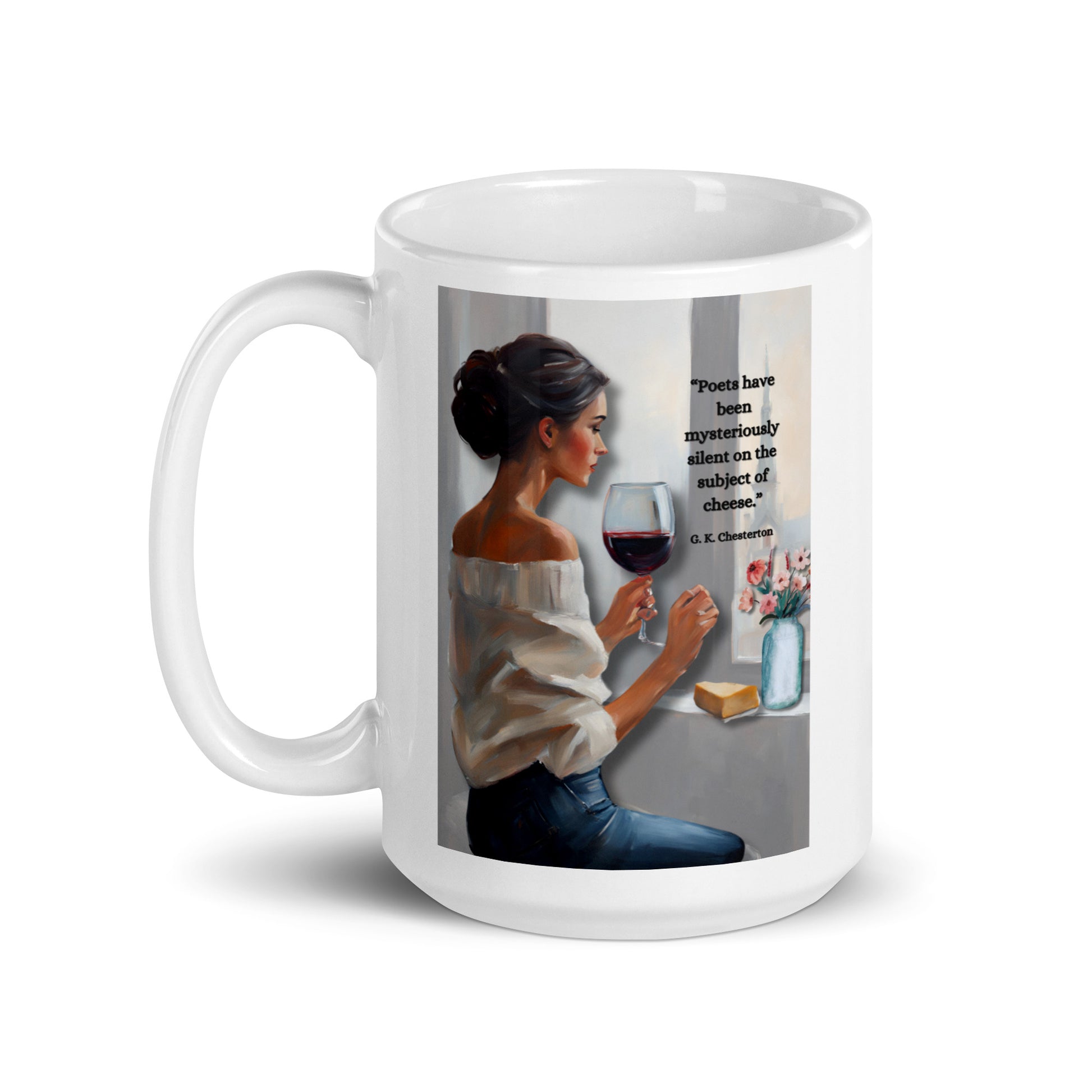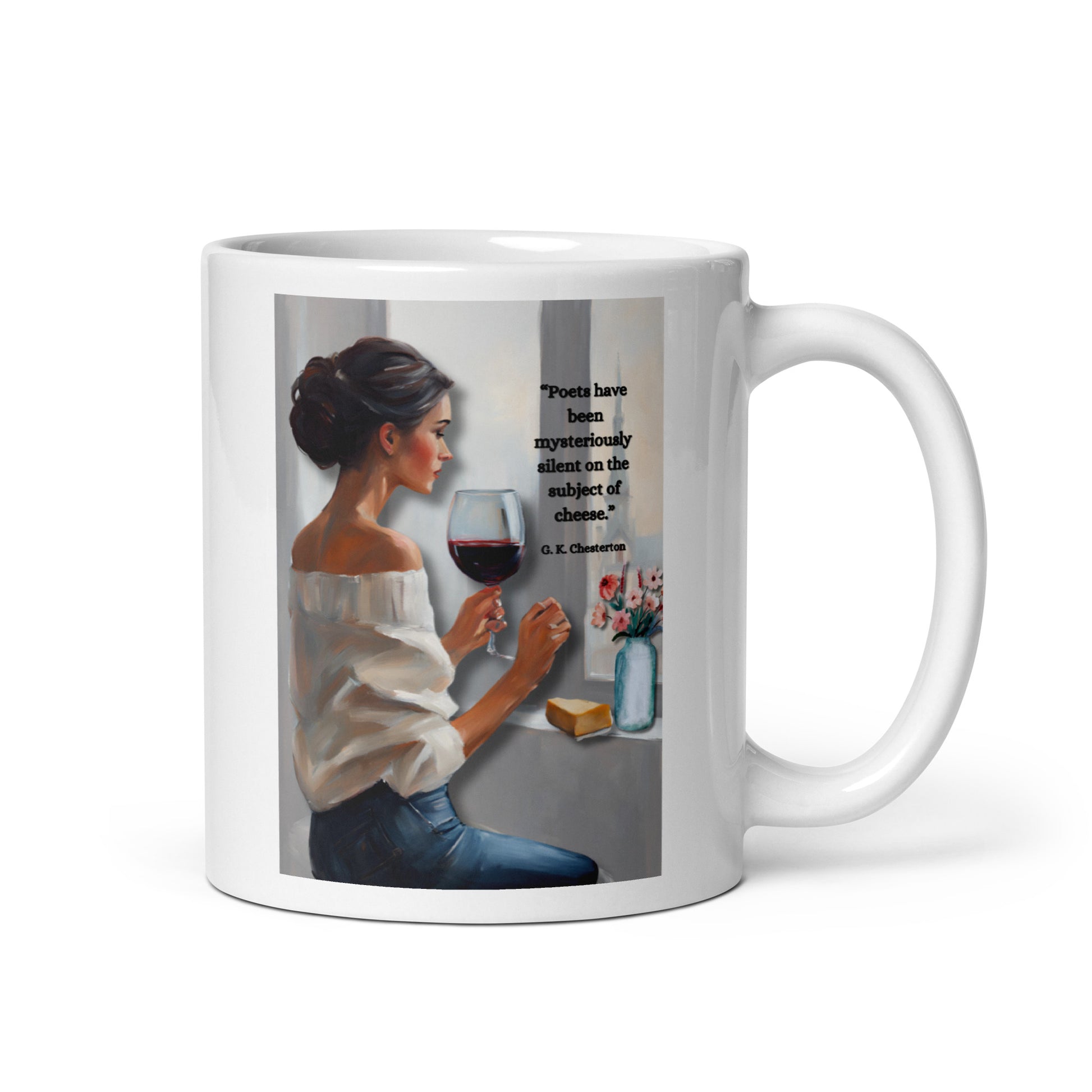 'Cheese' white glossy mug with impressionist style artwork and quote by author G.K. Chesterton