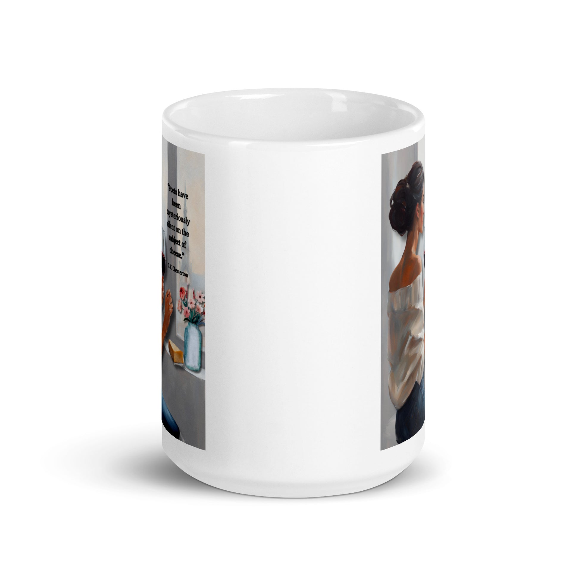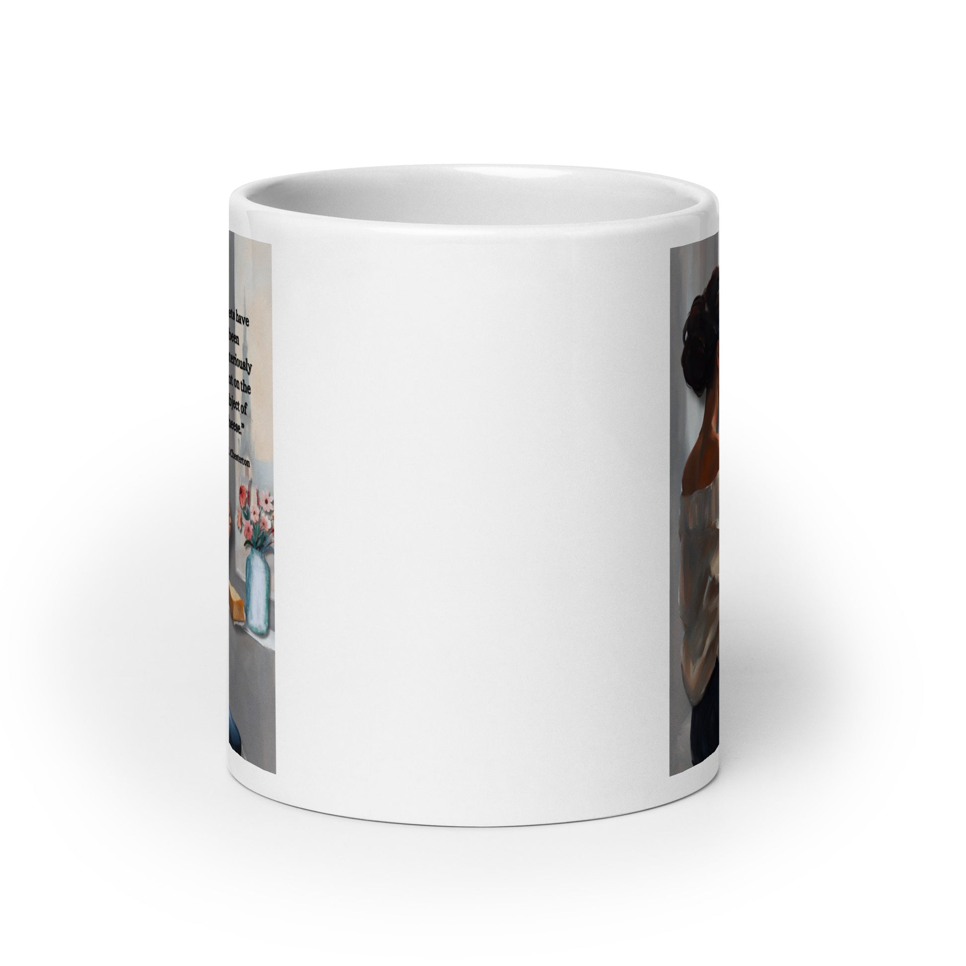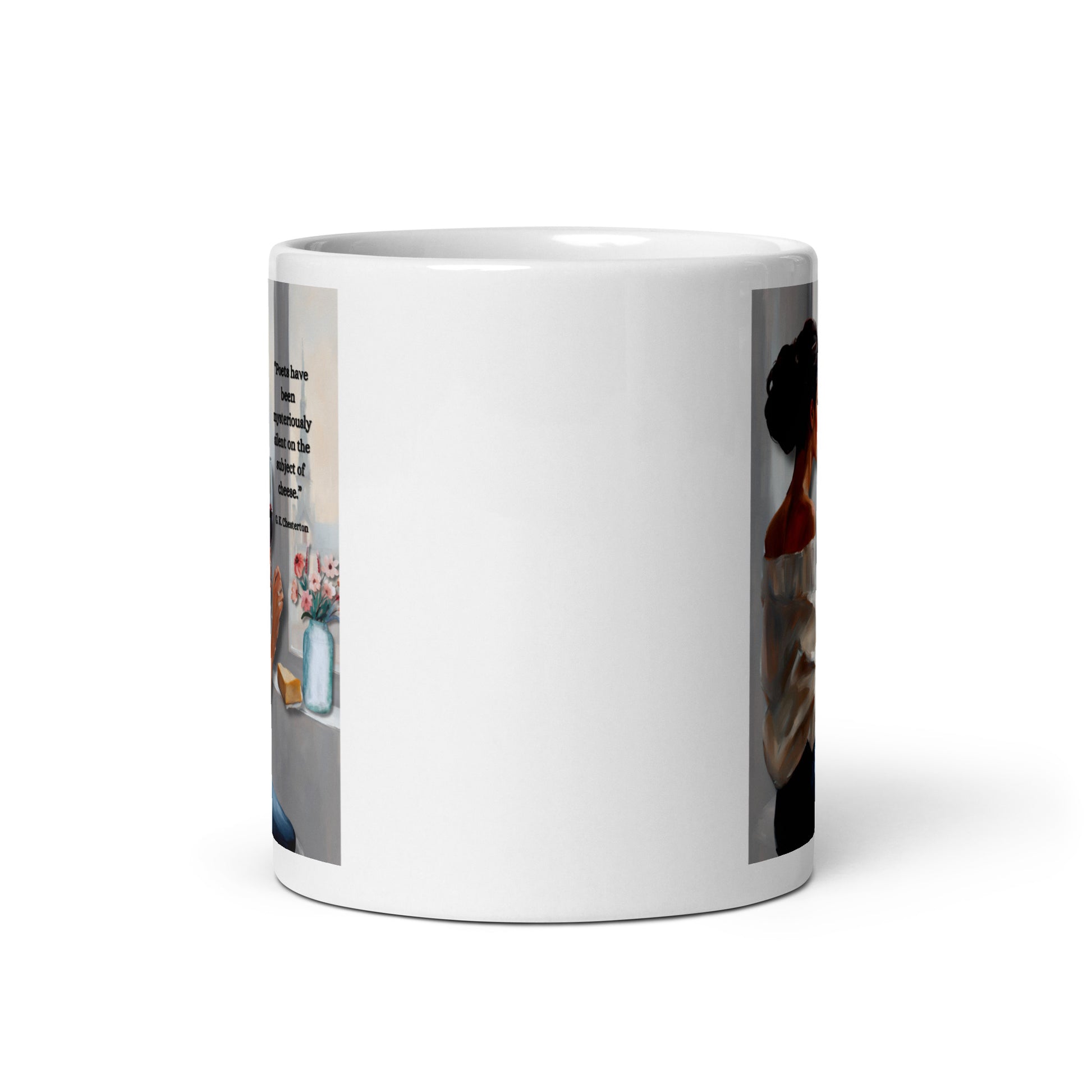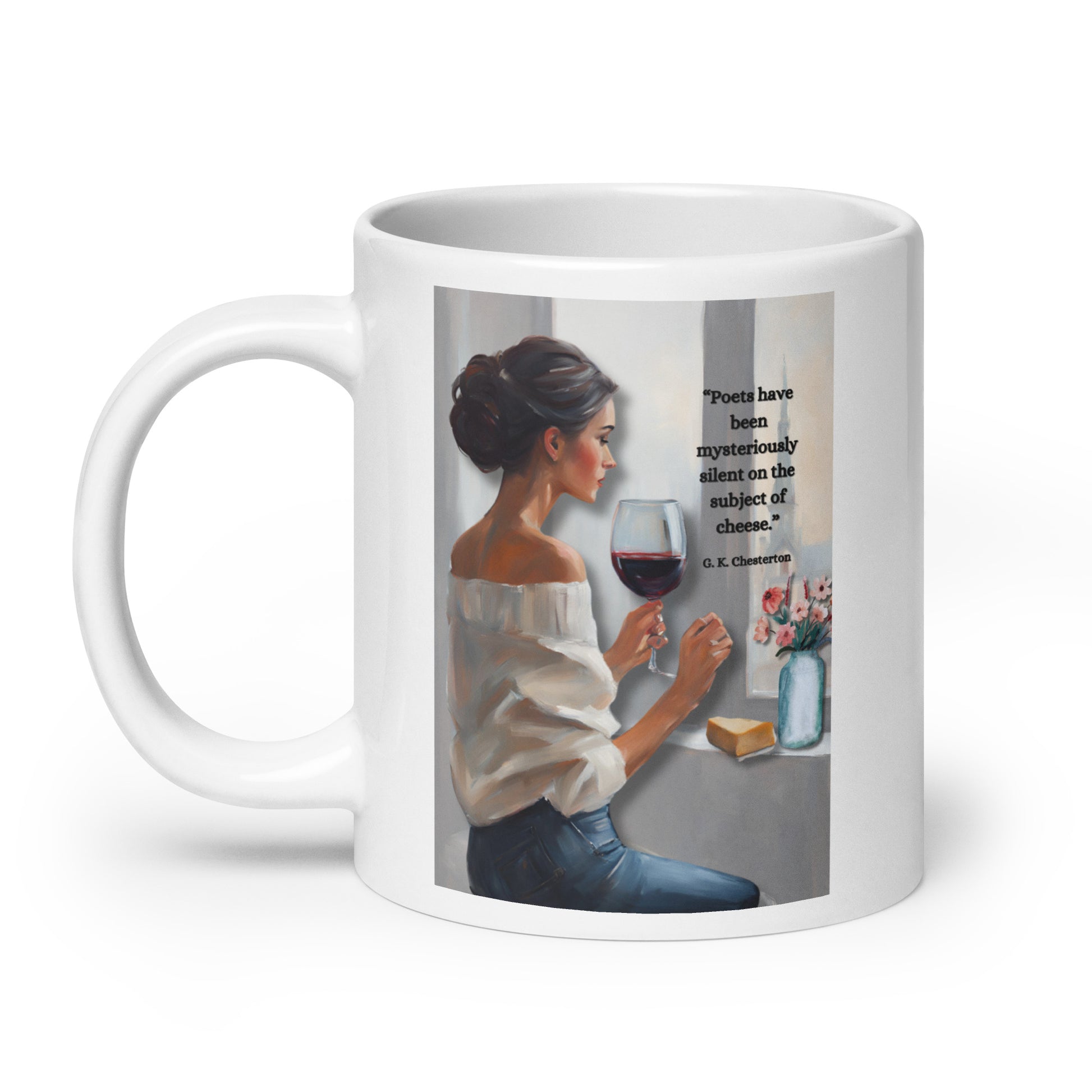 'Cheese' white glossy mug with impressionist style artwork and quote by author G.K. Chesterton