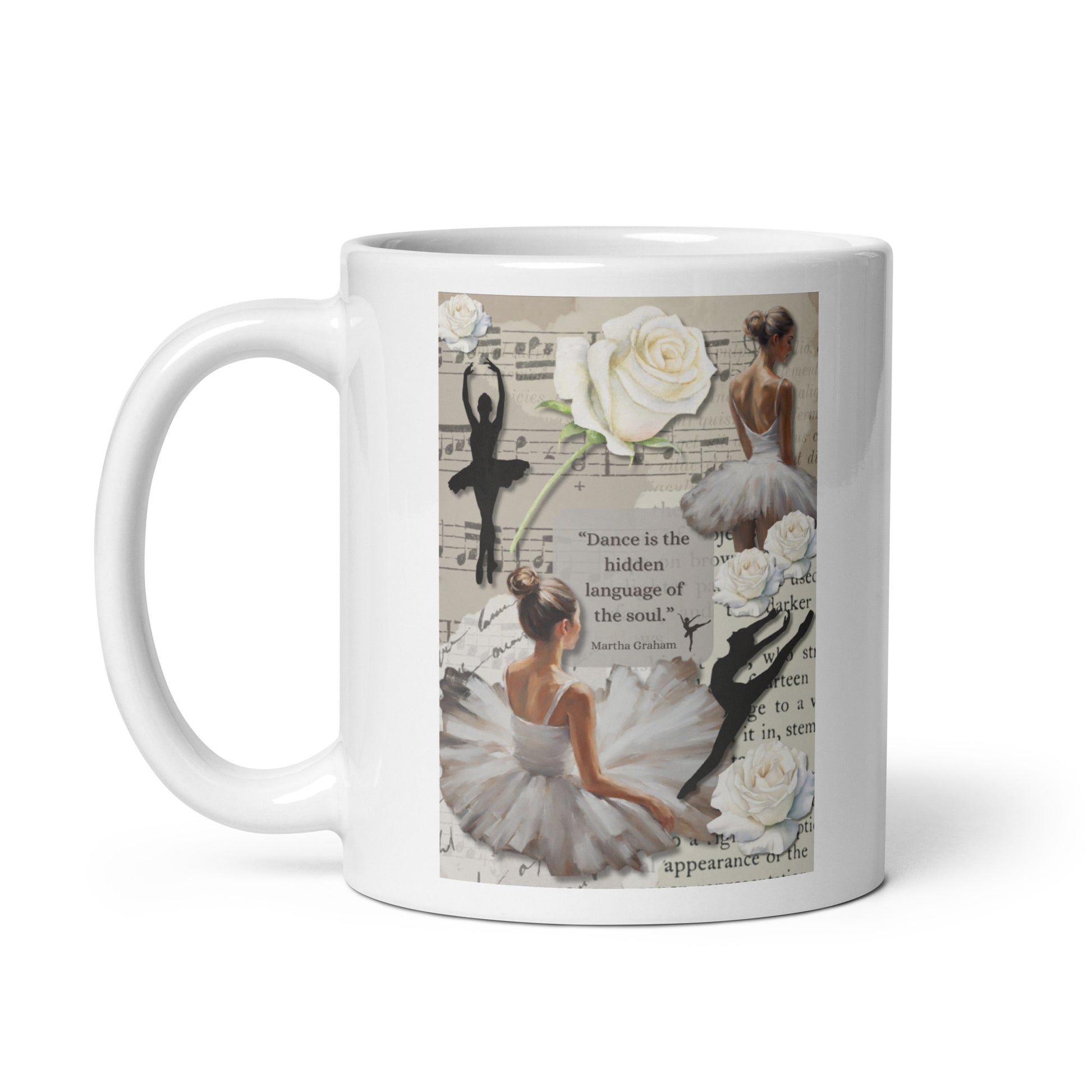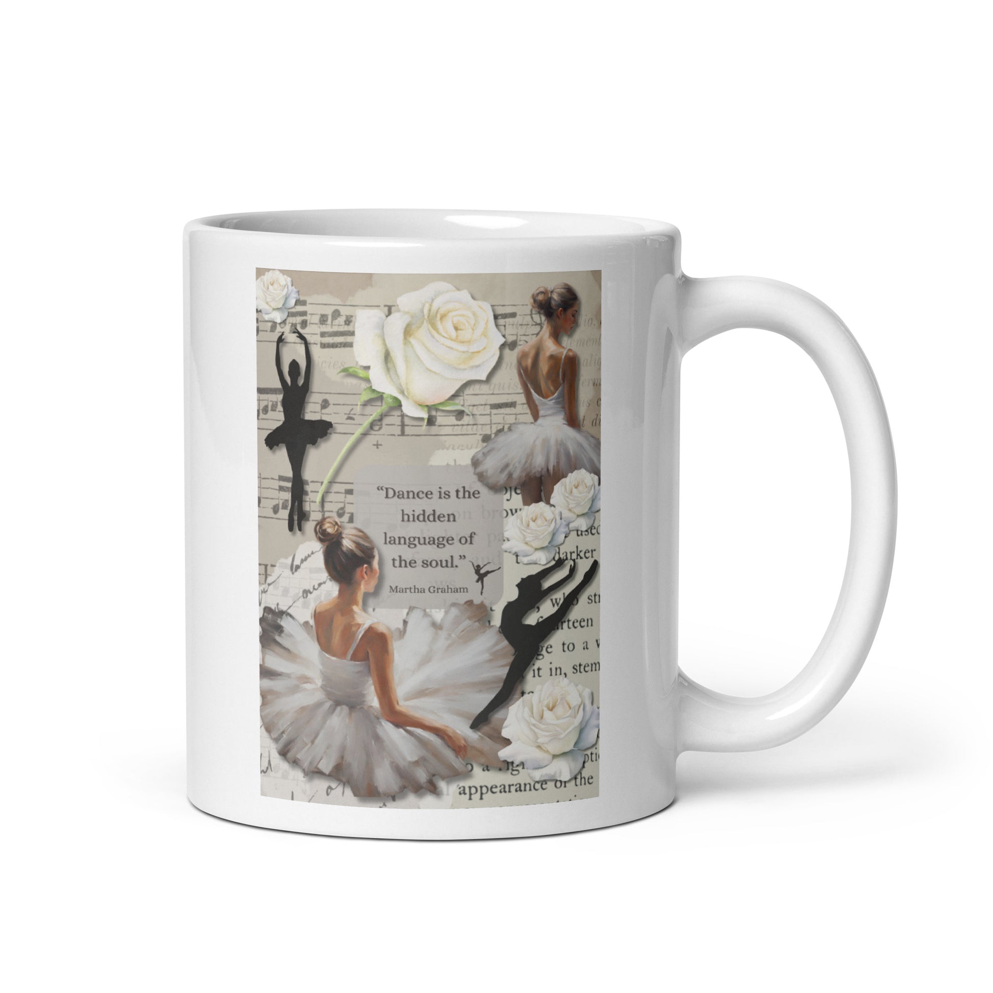 Calling all dance and coffee lovers. Whether you're drinking your morning coffee, evening tea, or something in between—this mug's for you! It's sturdy and glossy with a vivid print that'll withstand the microwave and dishwasher. Contains quote from dancer and choreographer Martha Graham:
