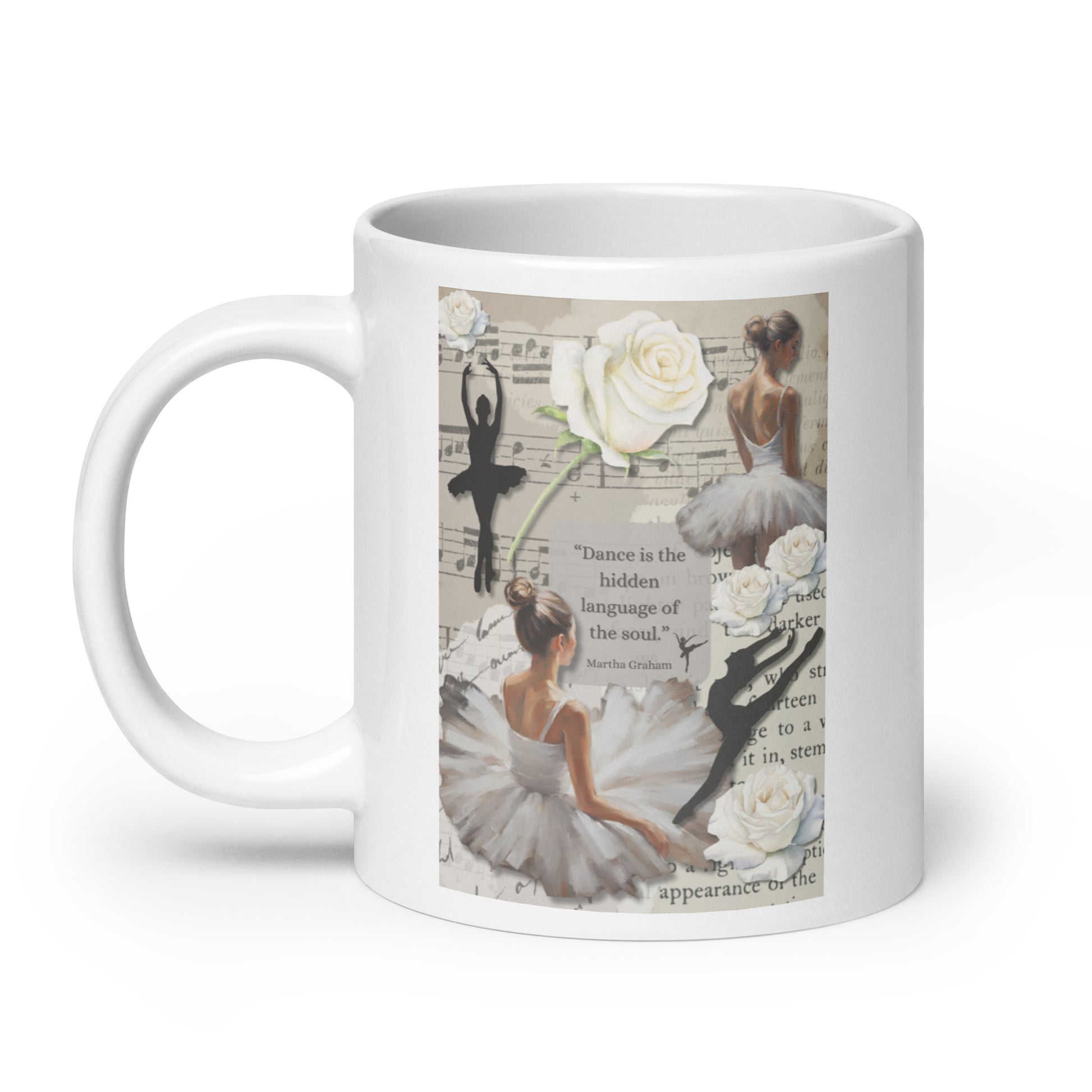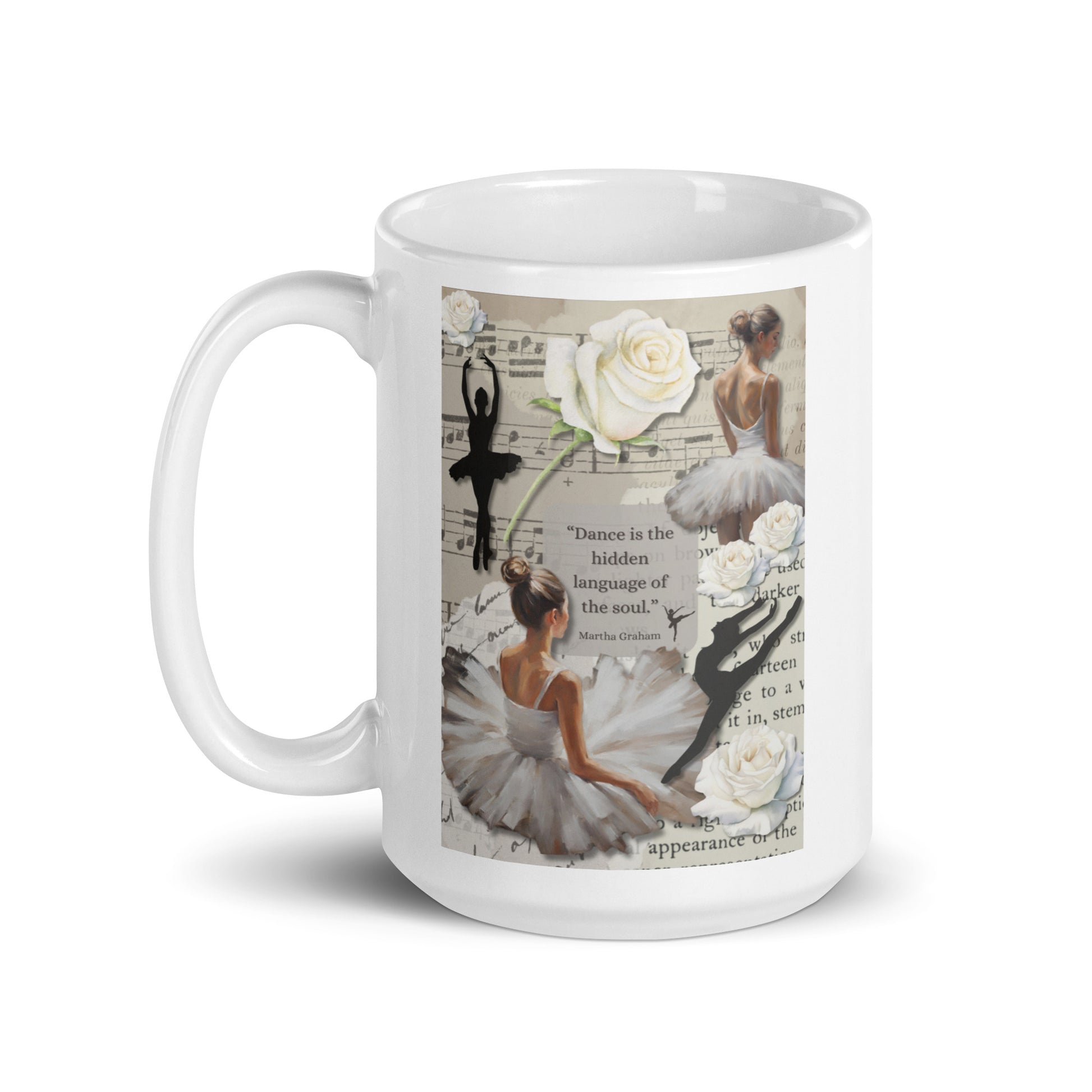 'Dance' white glossy mug with impressionist oil style artwork and quote from dancer Martha Graham