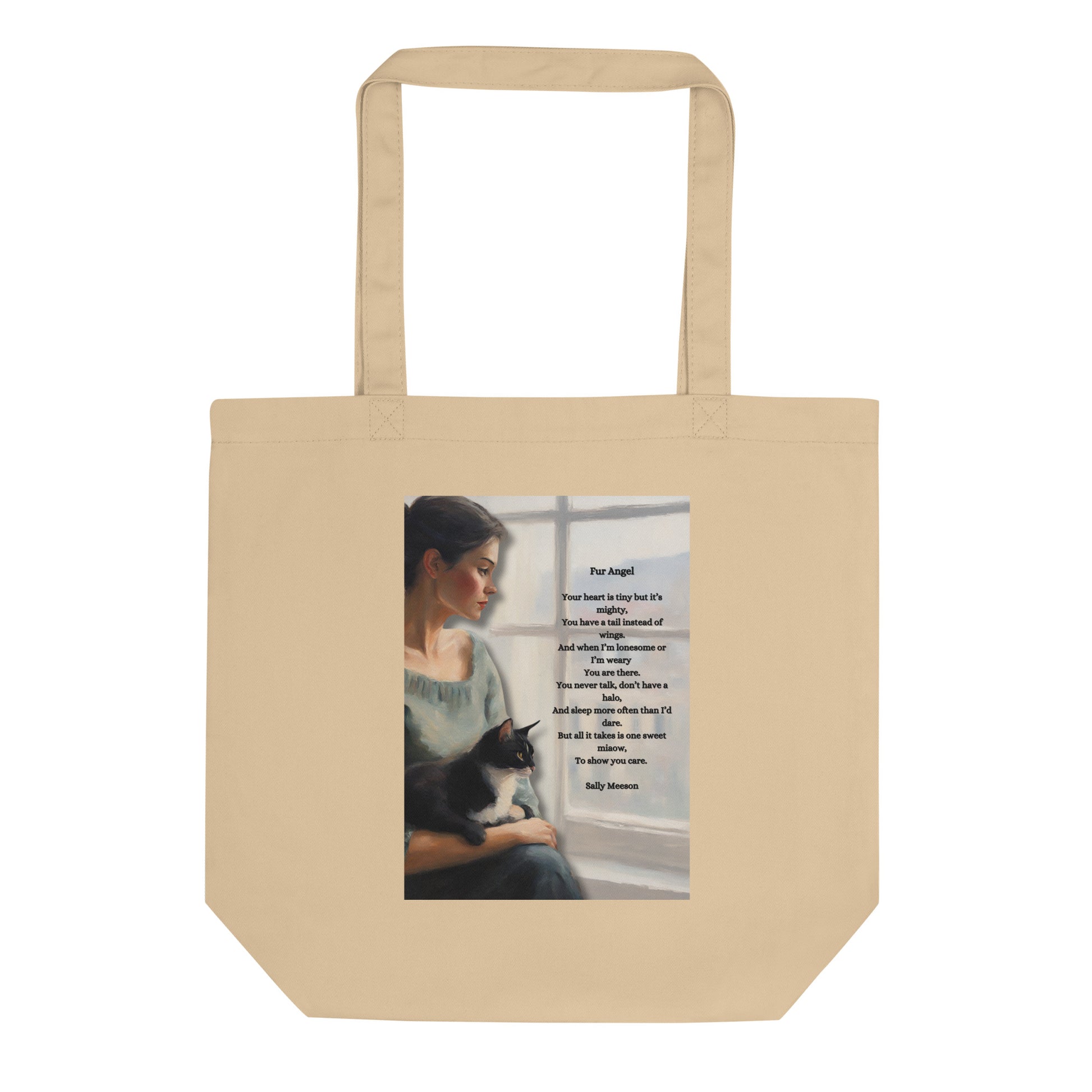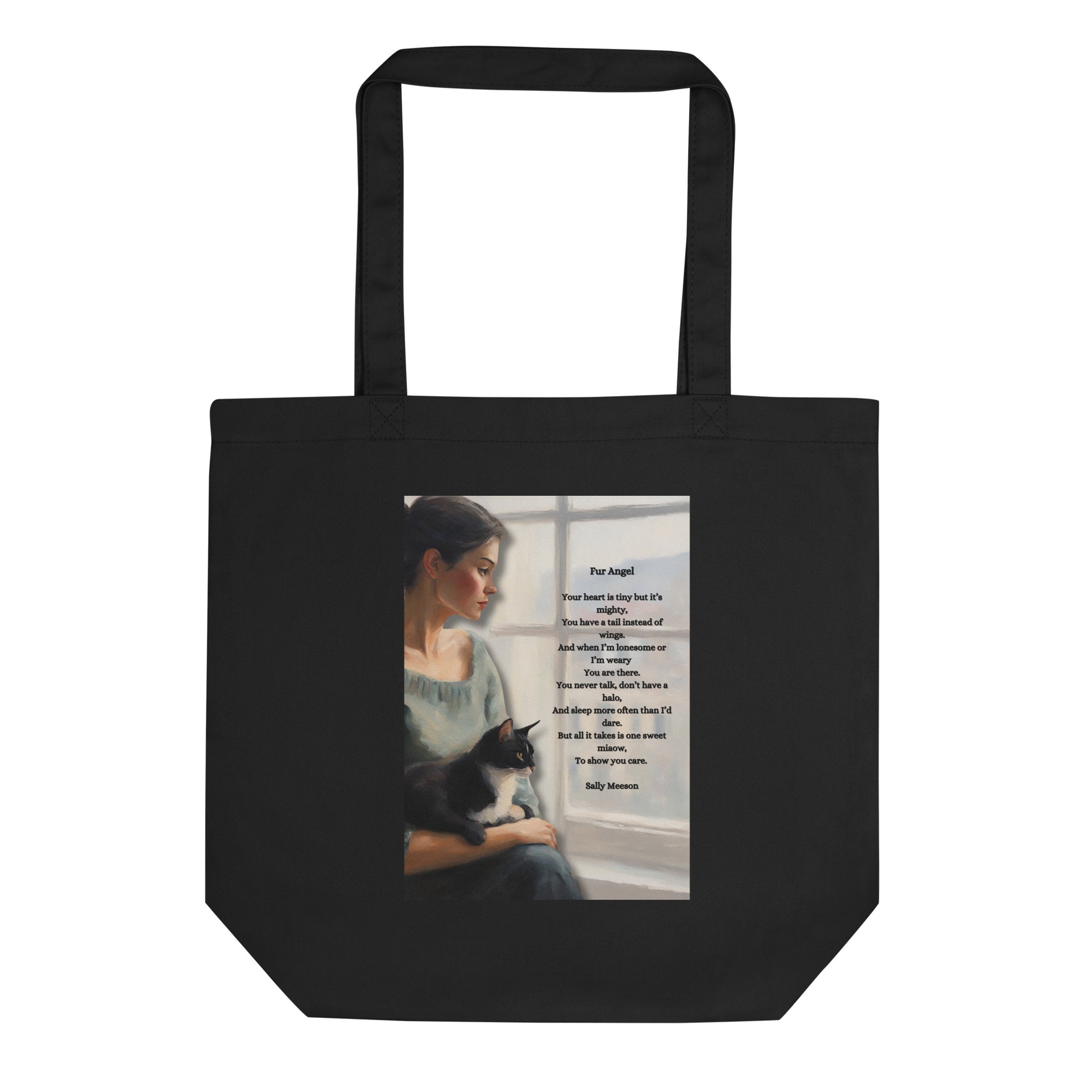 'Fur Angel' eco tote bag with impressionist style artwork and original poem by writer Sally Meeson