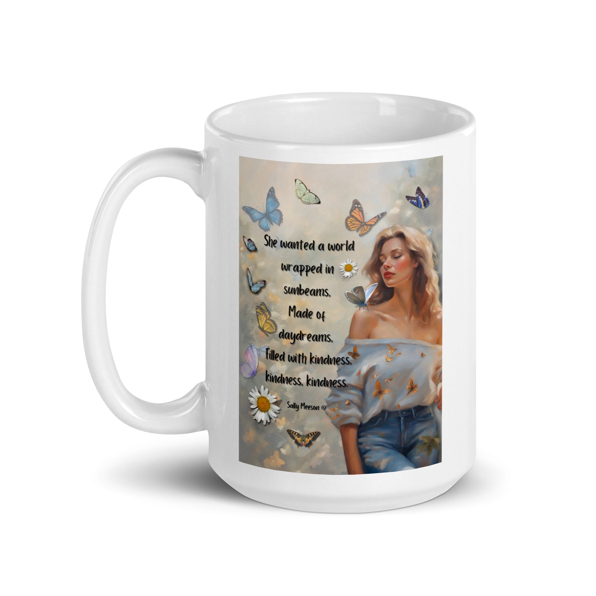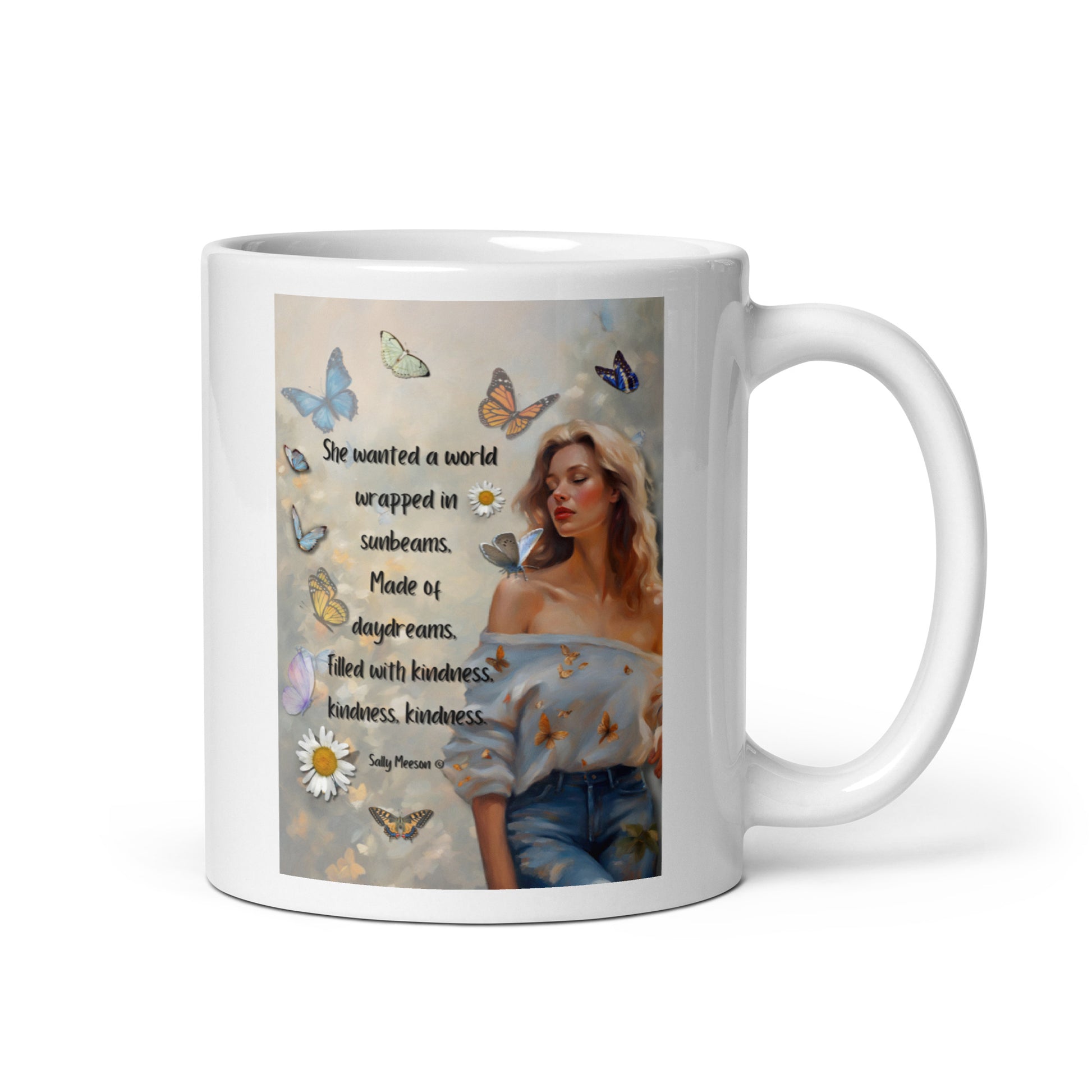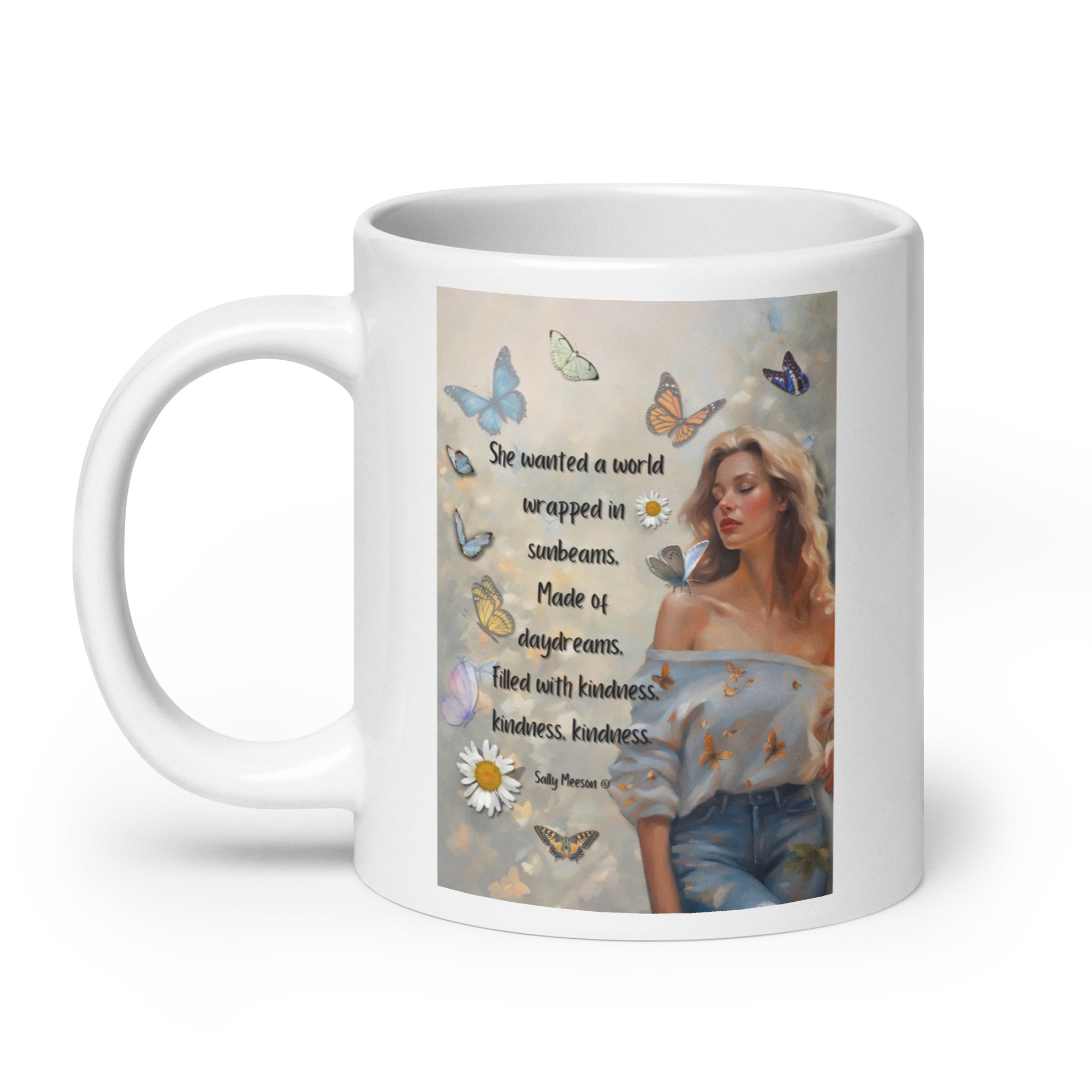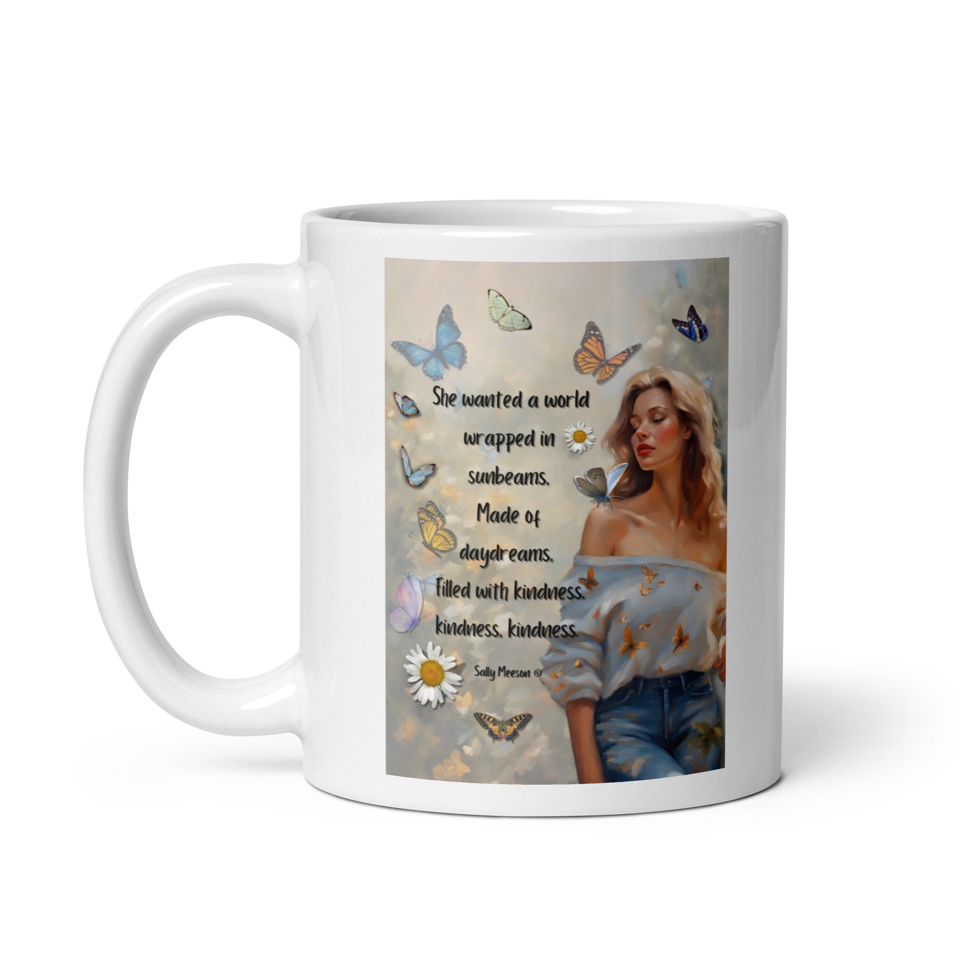'Kindness' white glossy mug with impressionist oil style artwork and quote by writer Sally Meeson