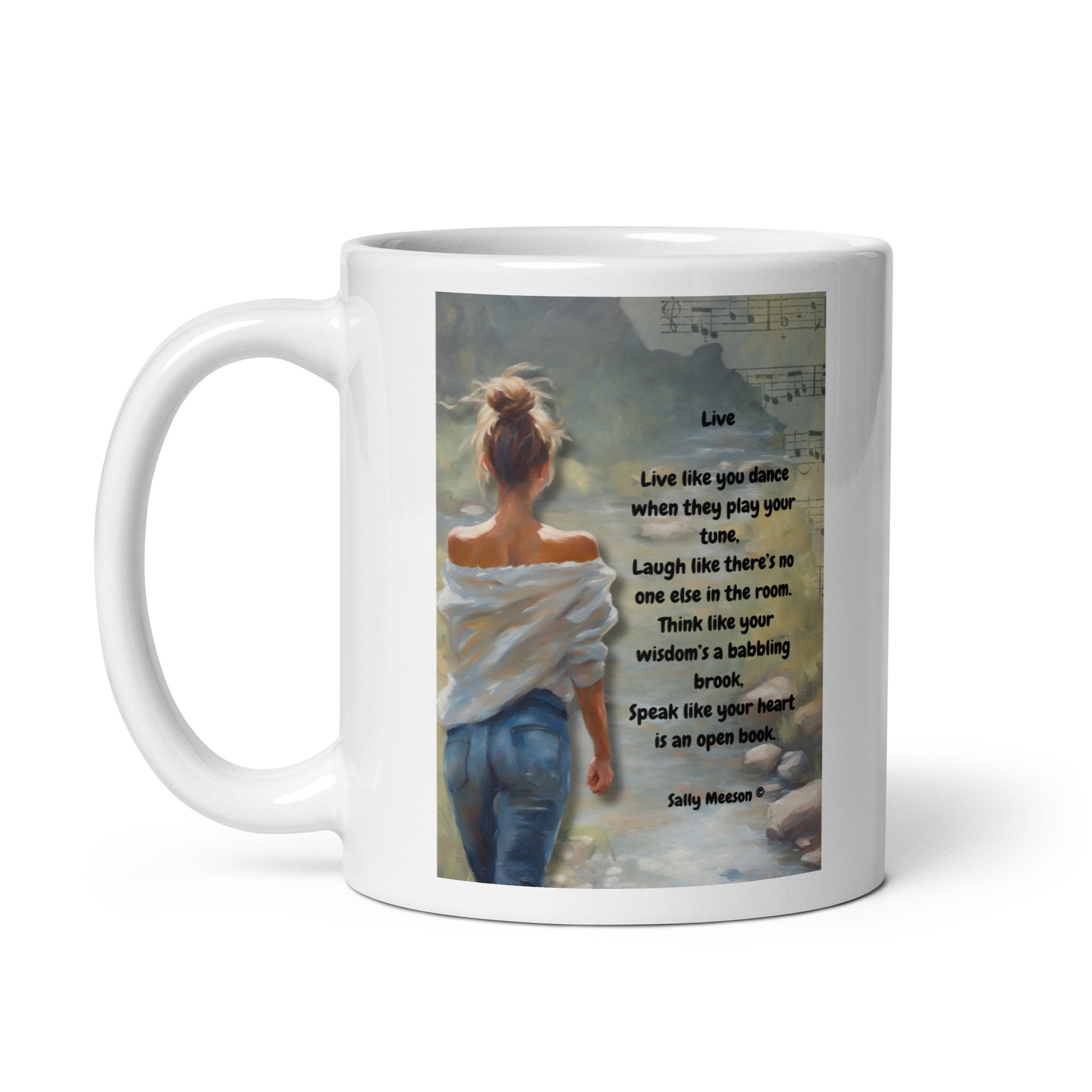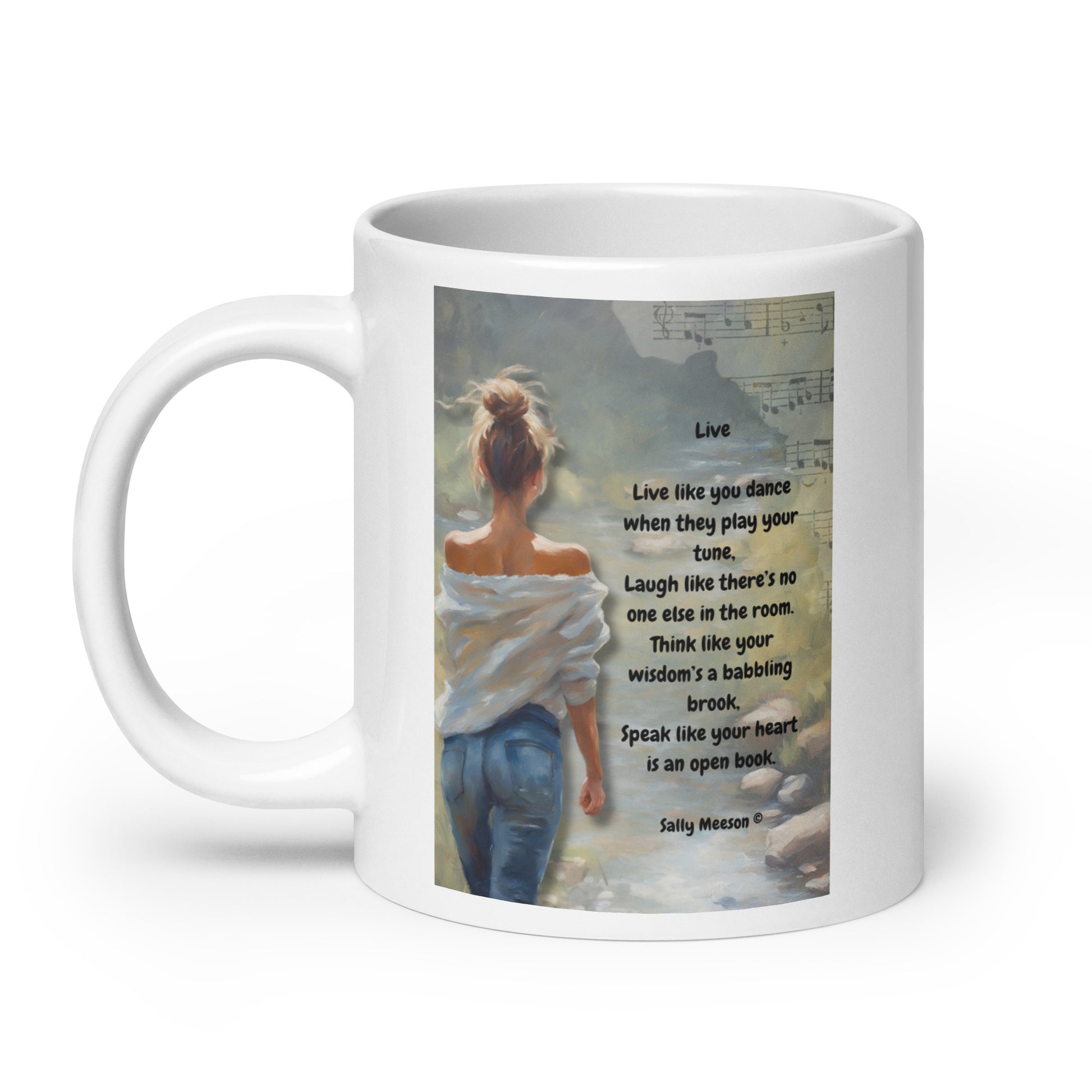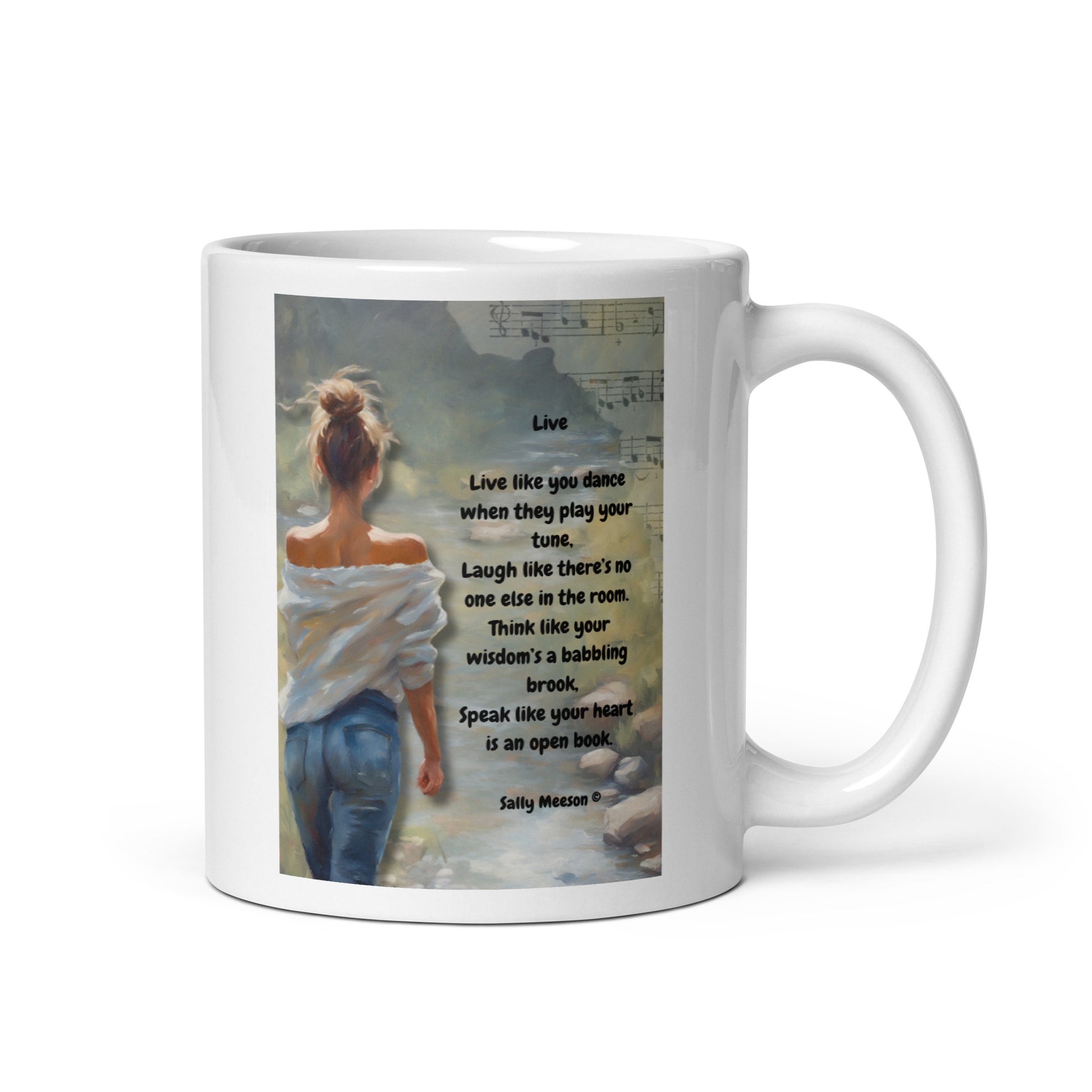 'Live' white glossy mug with impressionist oil style artwork and original poem by writer Sally Meeson
