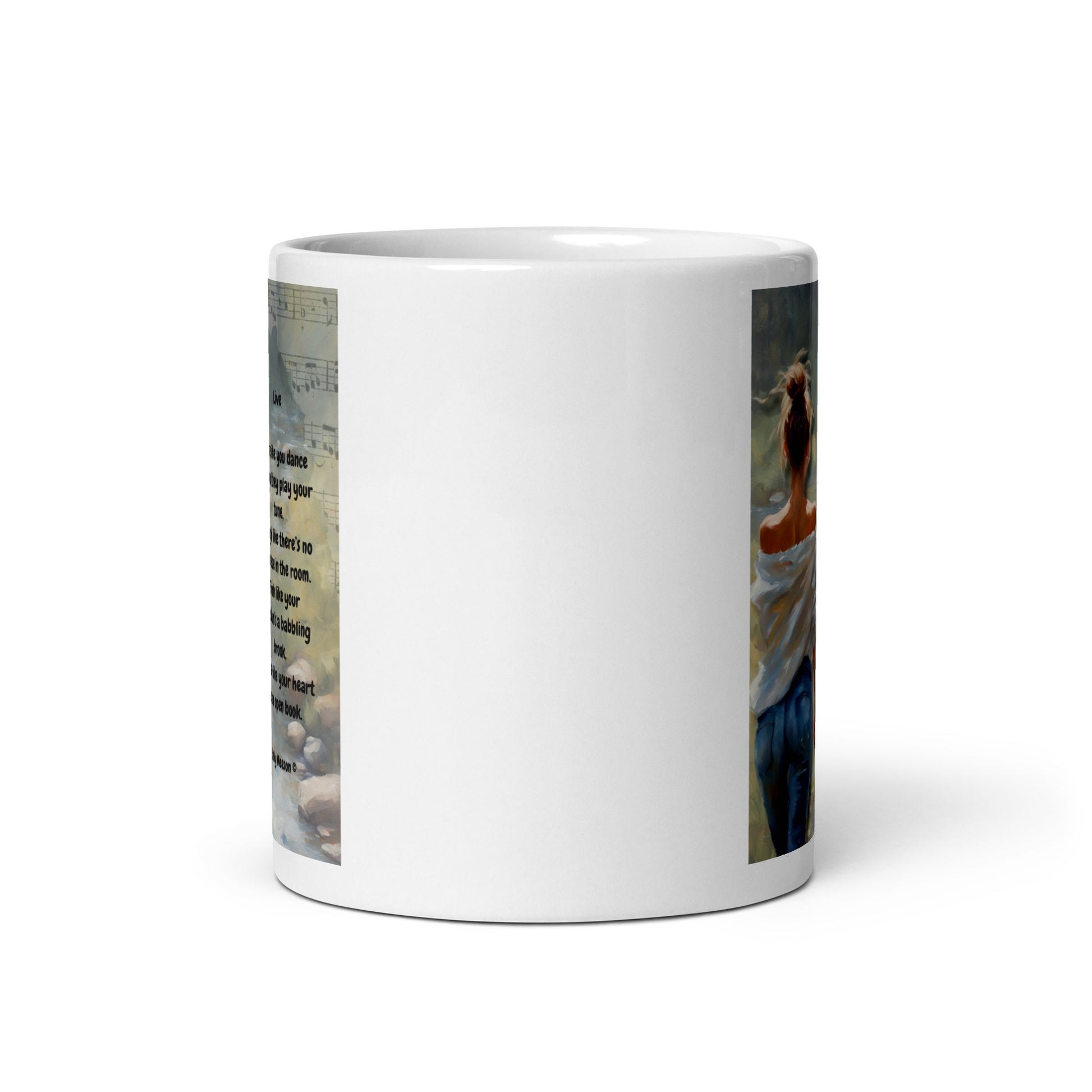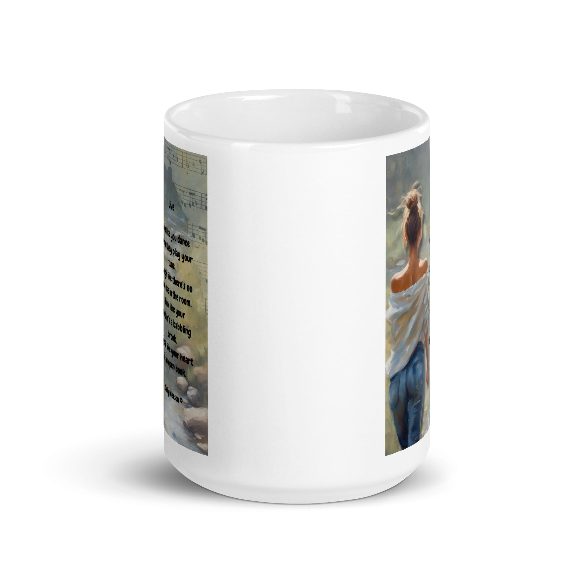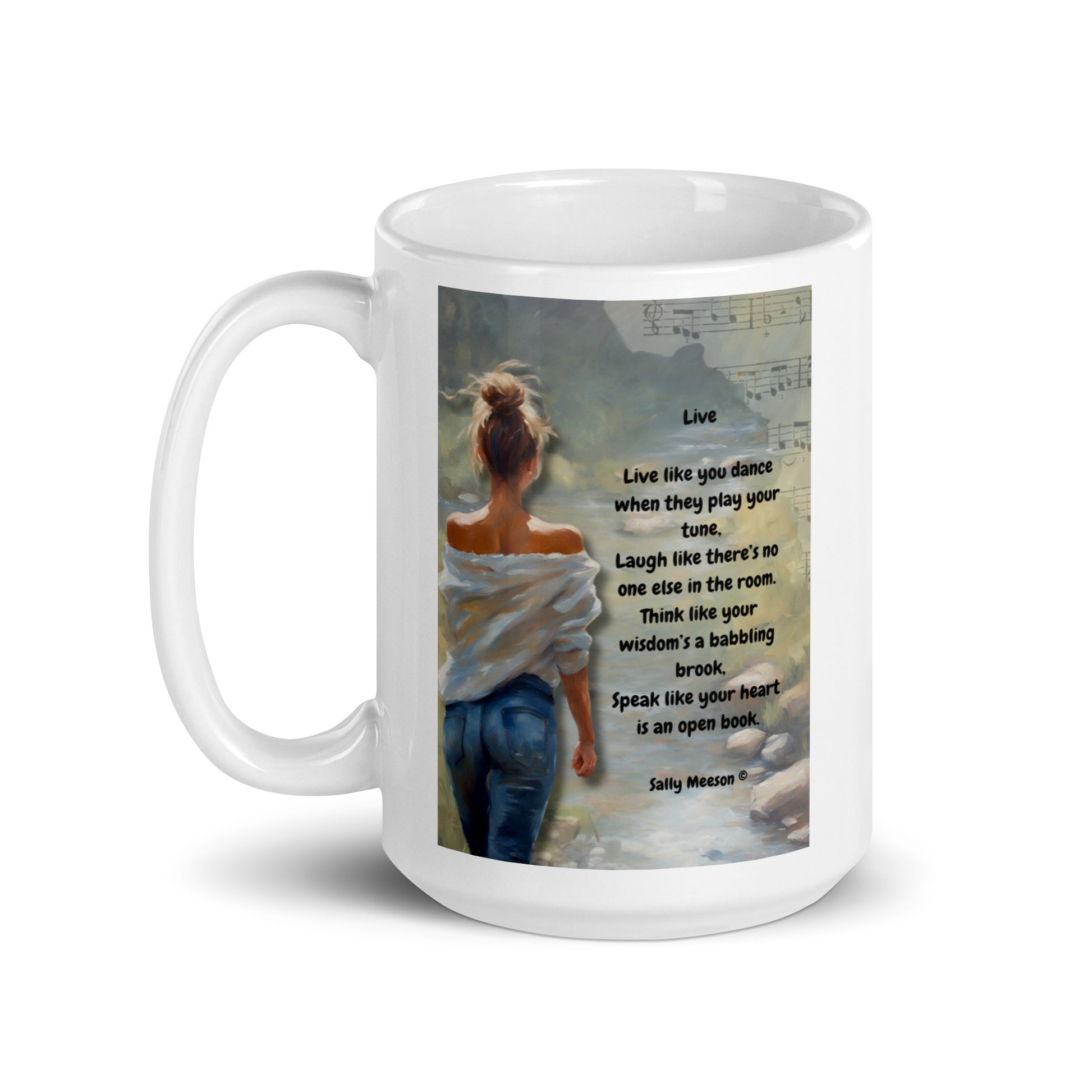 'Live' white glossy mug with impressionist oil style artwork and original poem by writer Sally Meeson