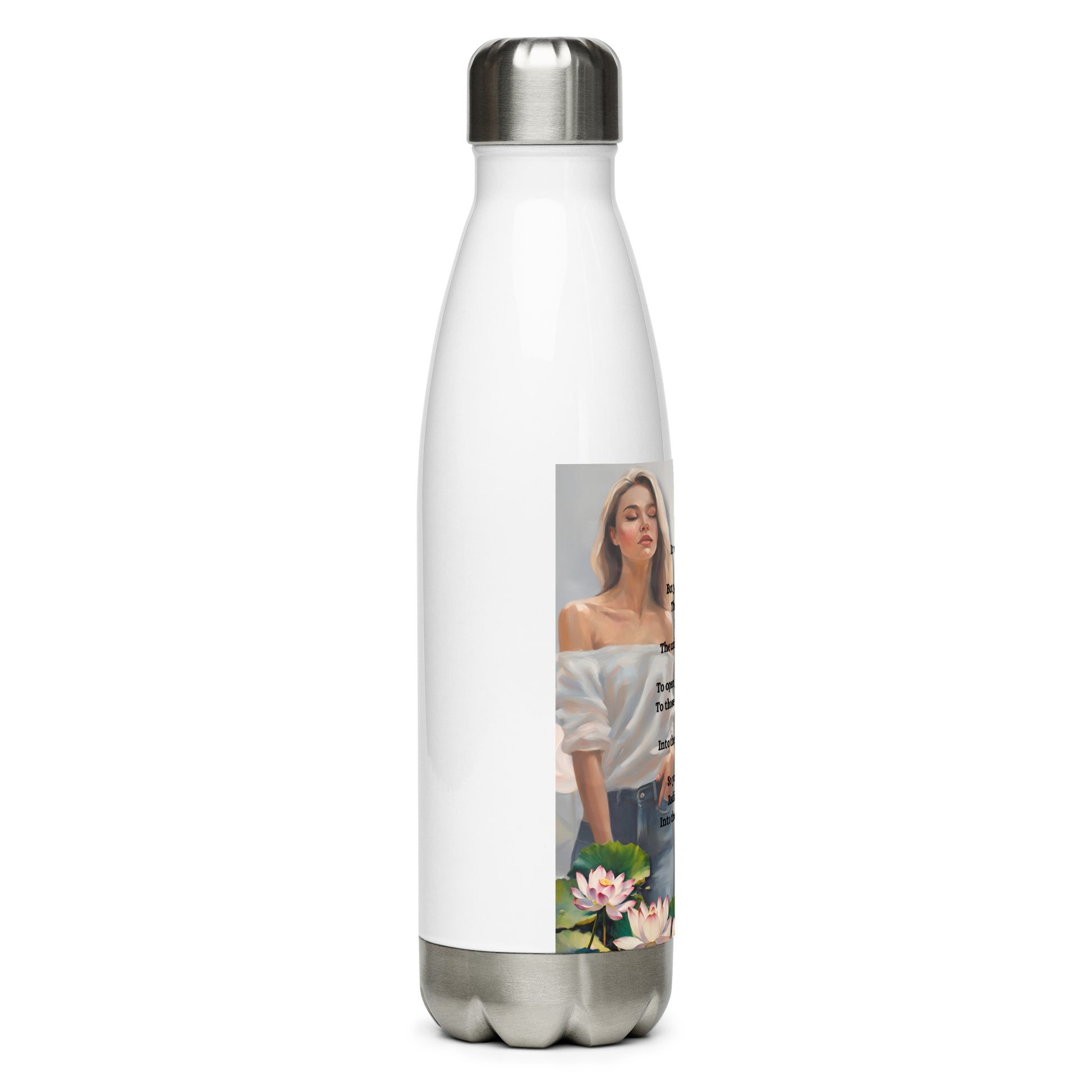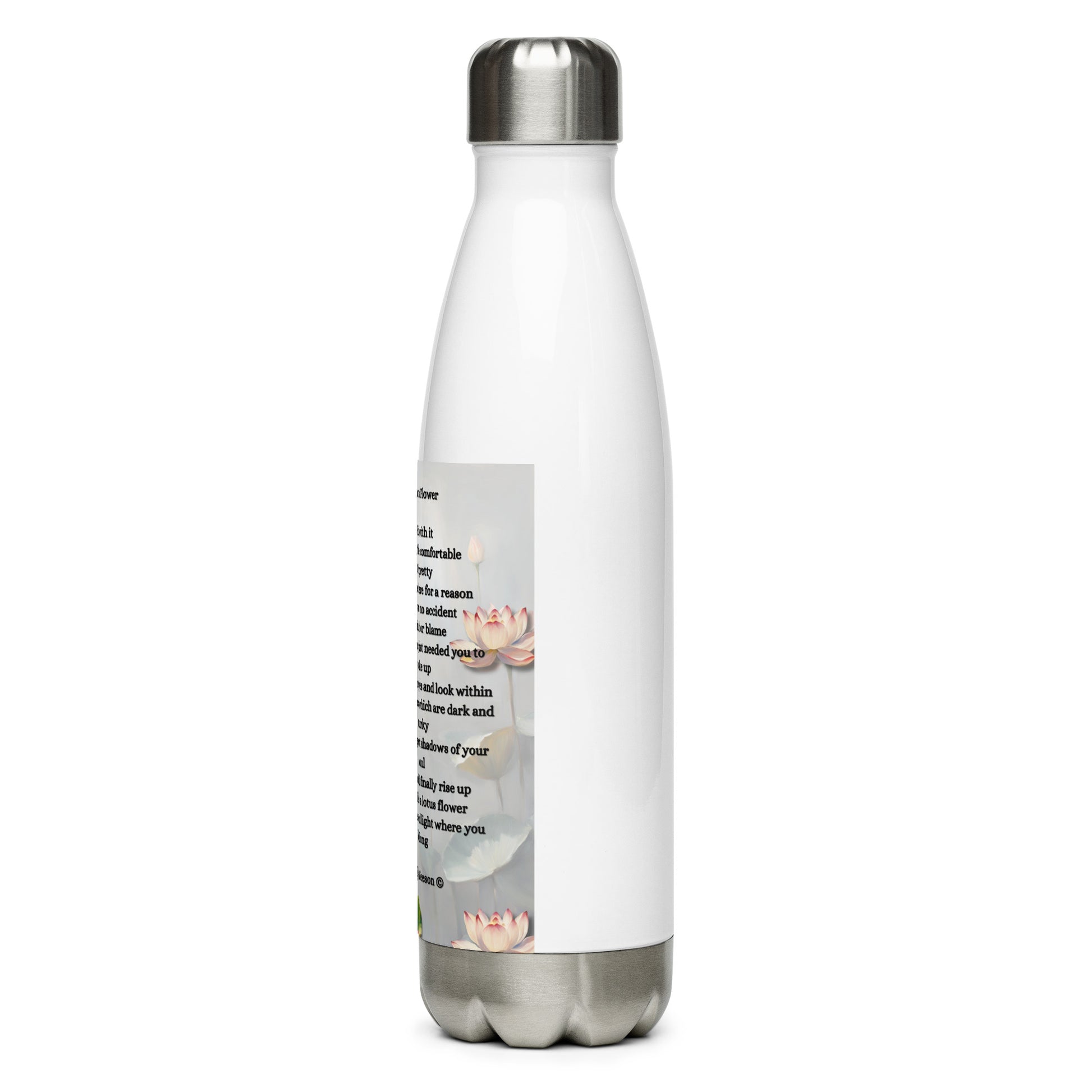 'Lotus Flower' stainless steel water bottle with impressionist oil style artwork and original poem by writer Sally Meeson