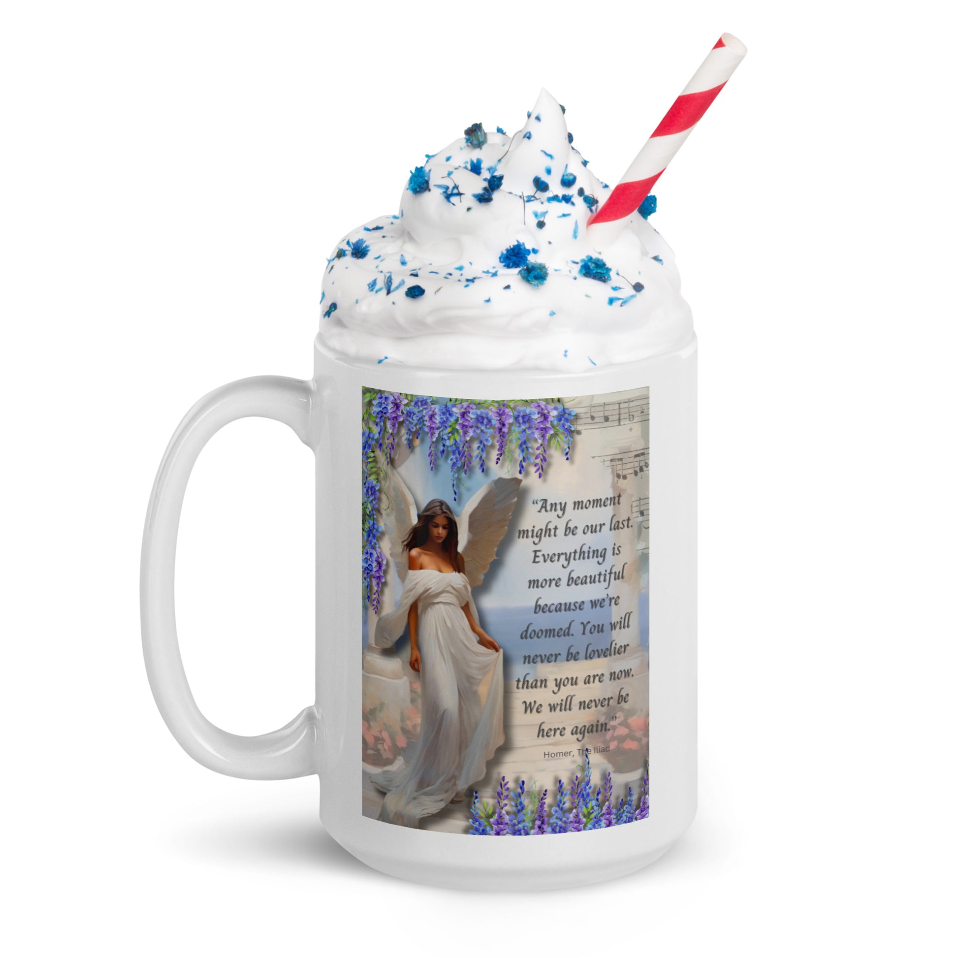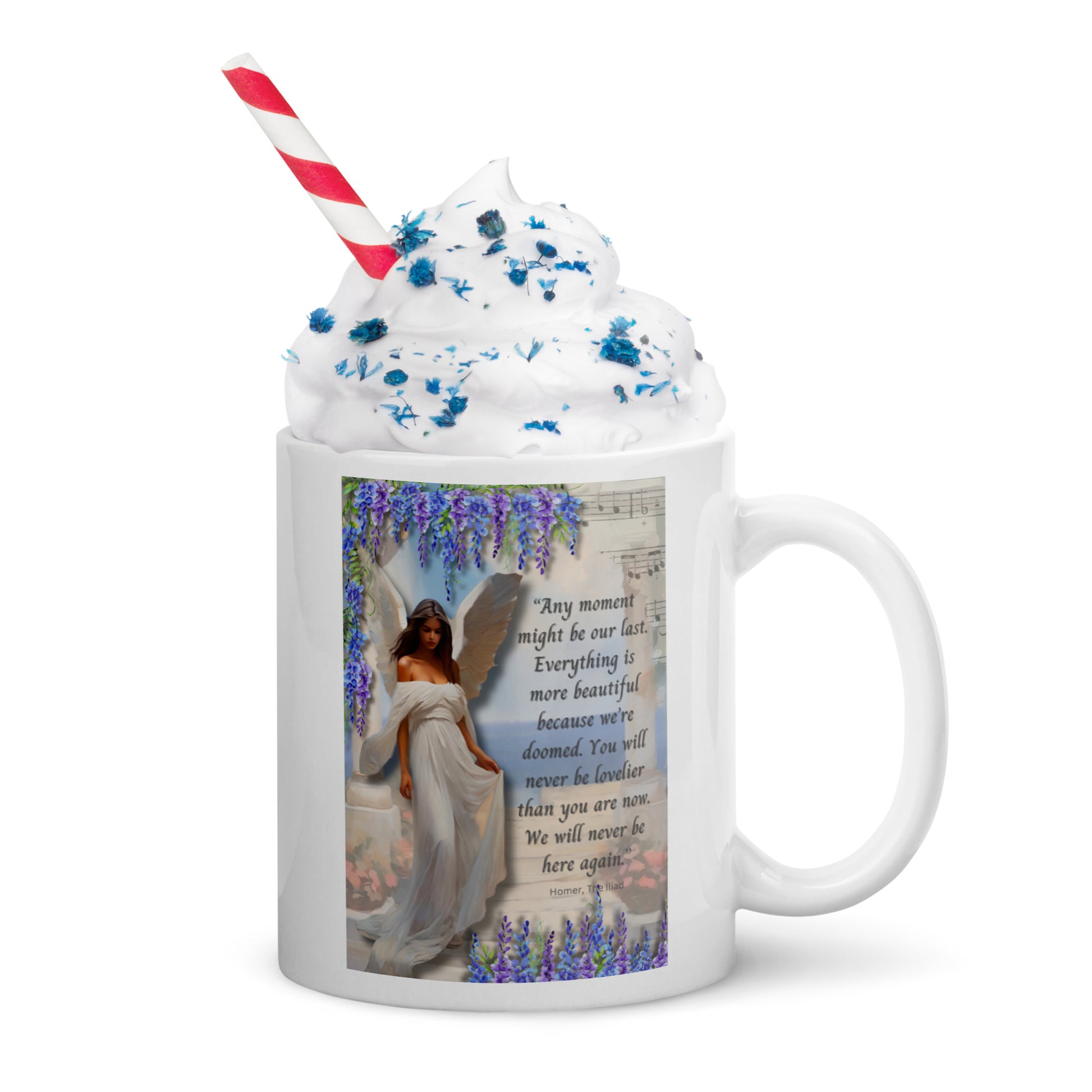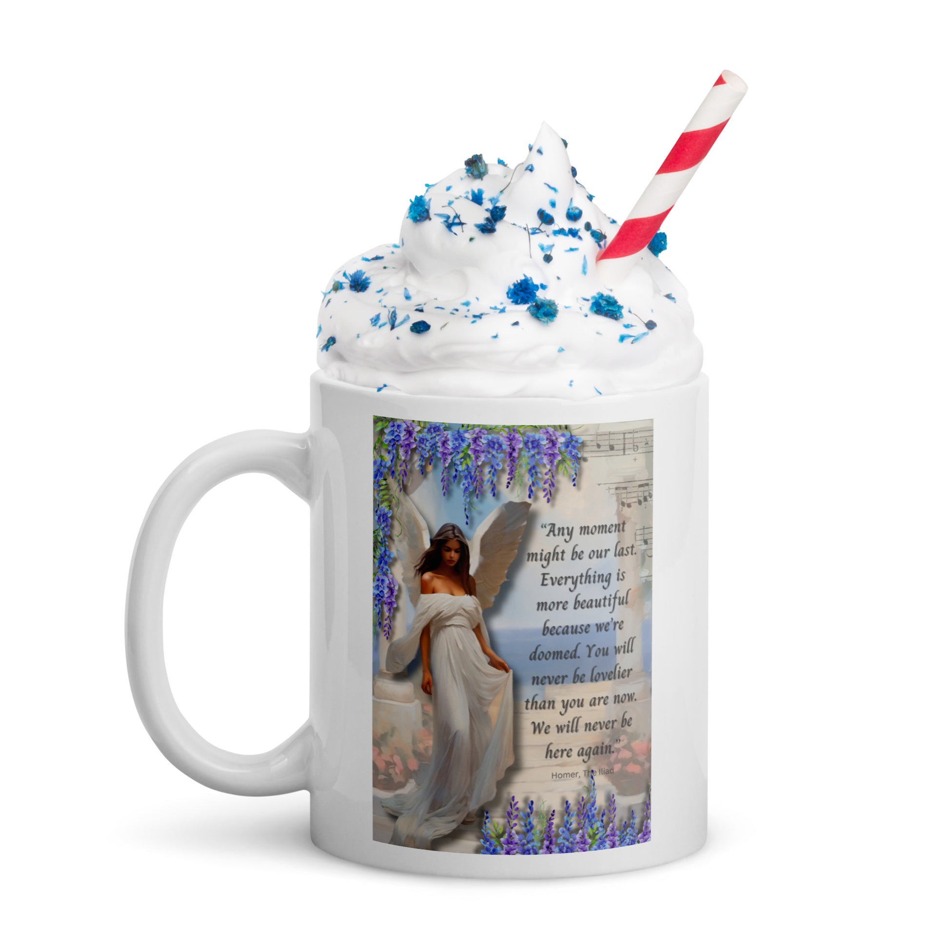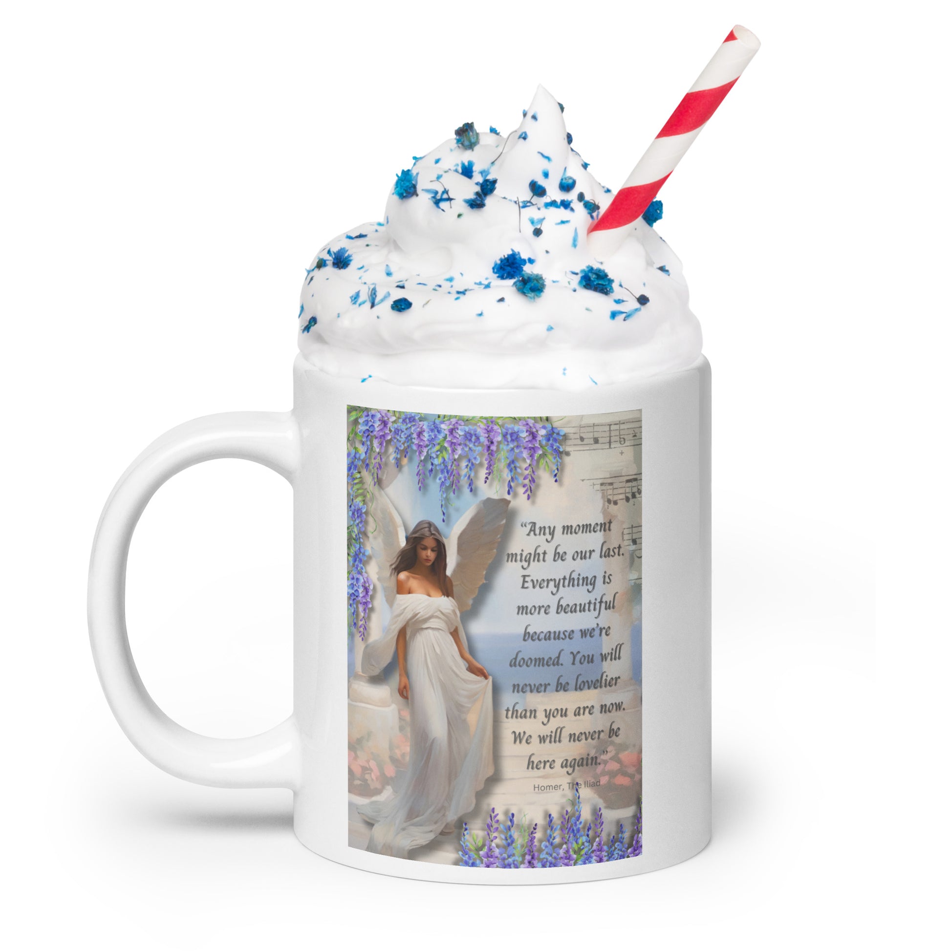 'Moments' white glossy mug with impressionist style artwork and quote from Homer's The Iliad