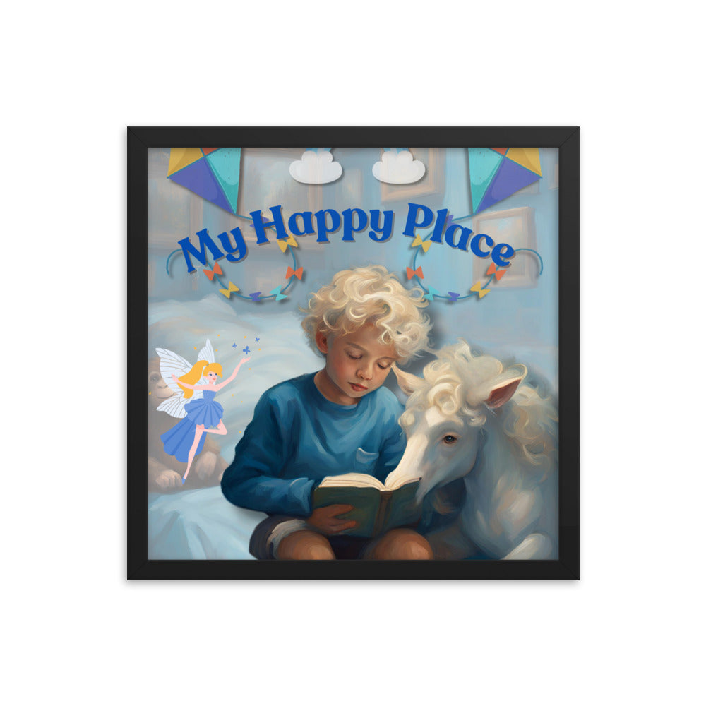 'My Happy Place' child's room blue framed photo paper poster with impressionist oil style artwork