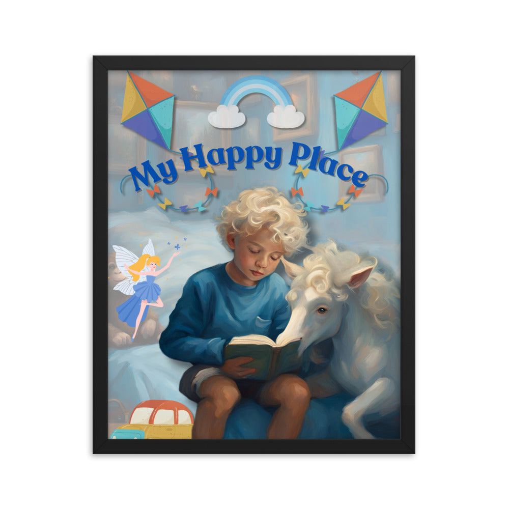 'My Happy Place' child's room blue framed photo paper poster with impressionist oil style artwork