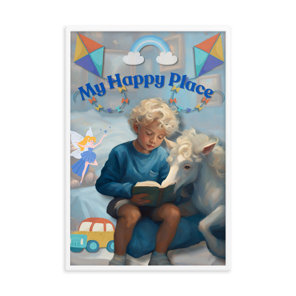 'My Happy Place' child's room blue framed photo paper poster with impressionist oil style artwork