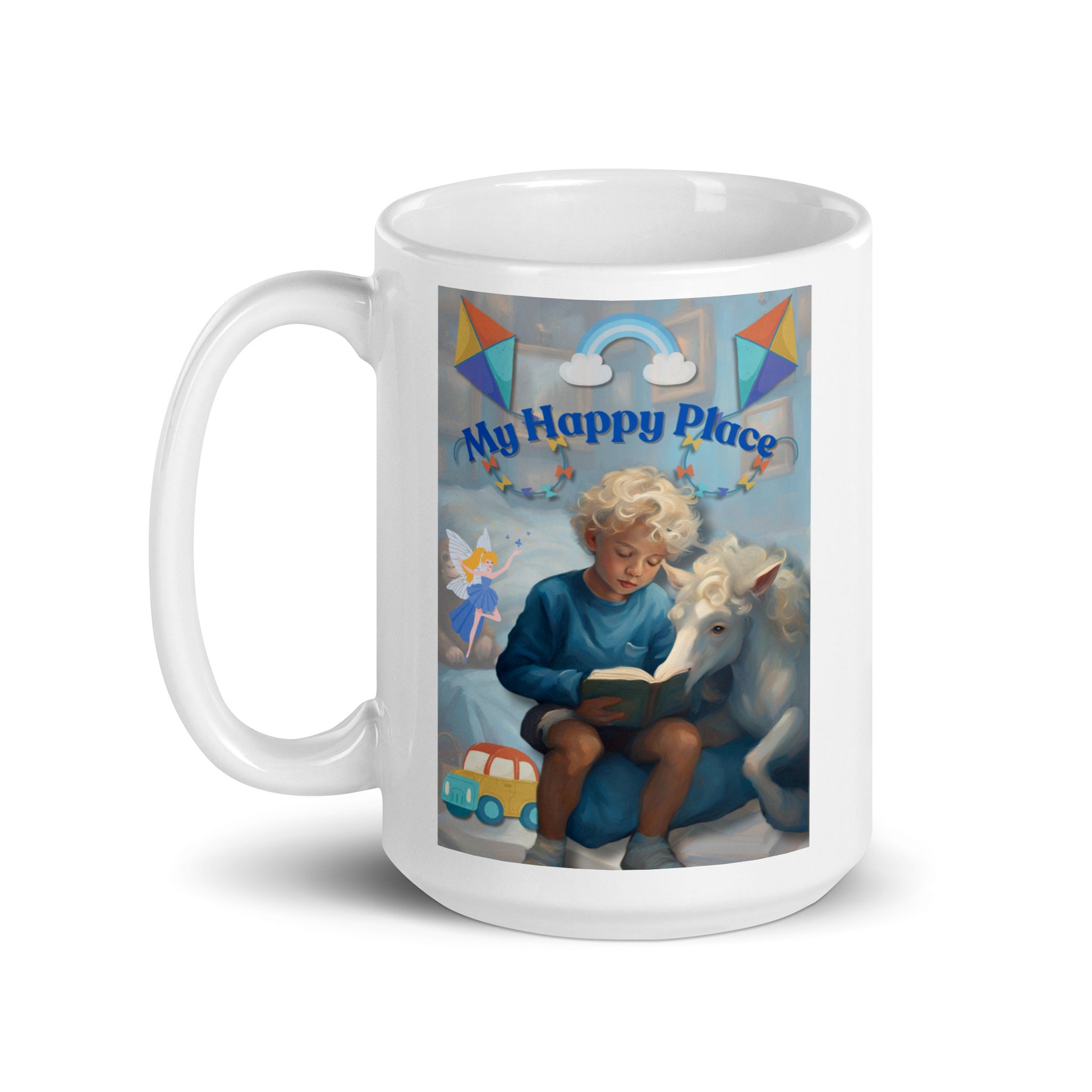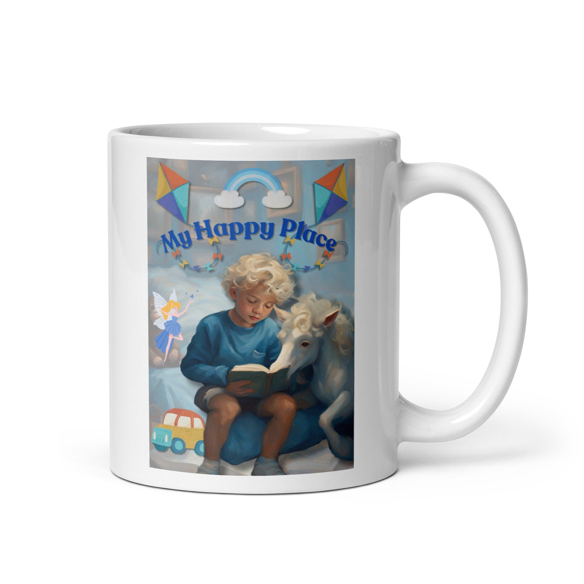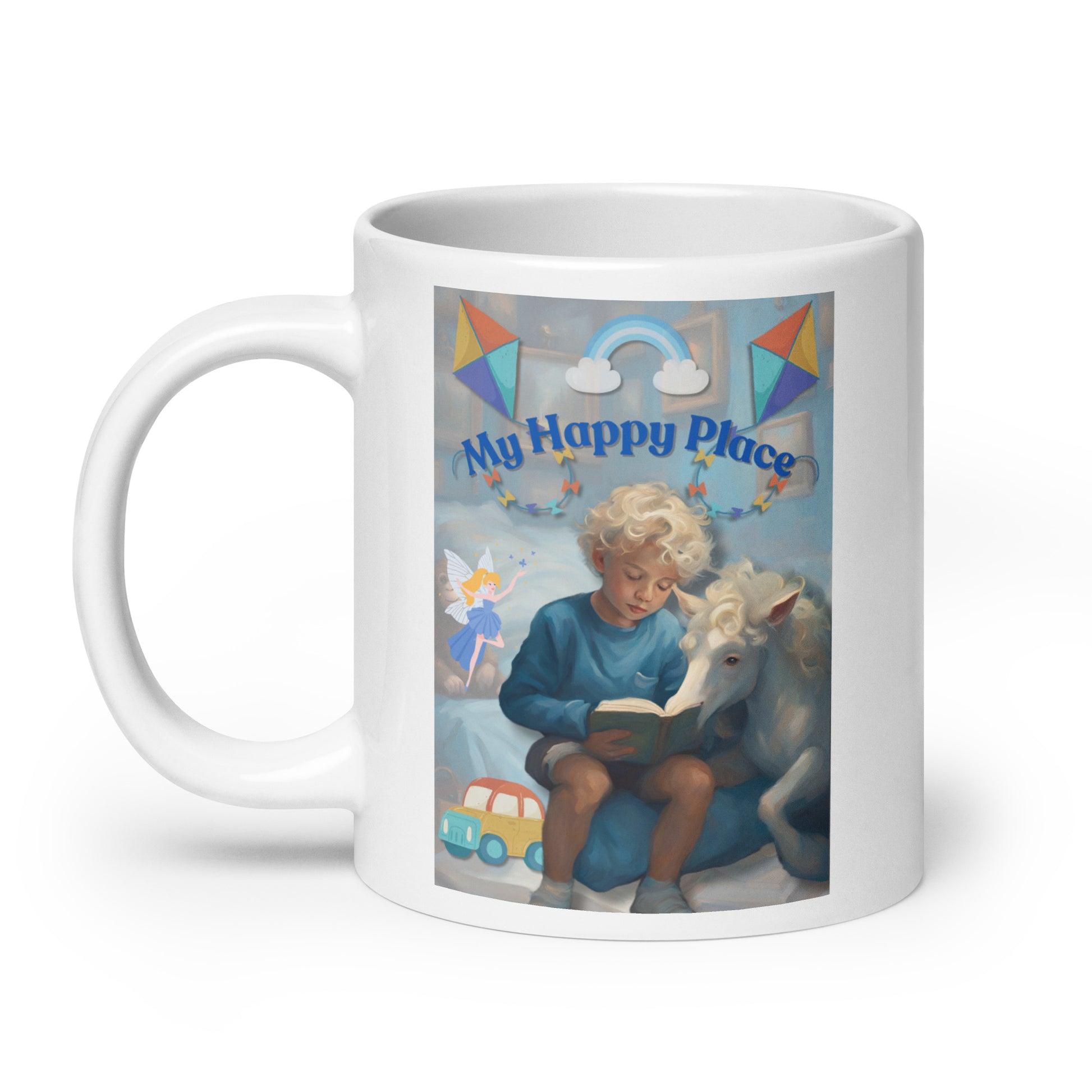 'My Happy Place' child's white glossy mug with blue impressionist oil style artwork