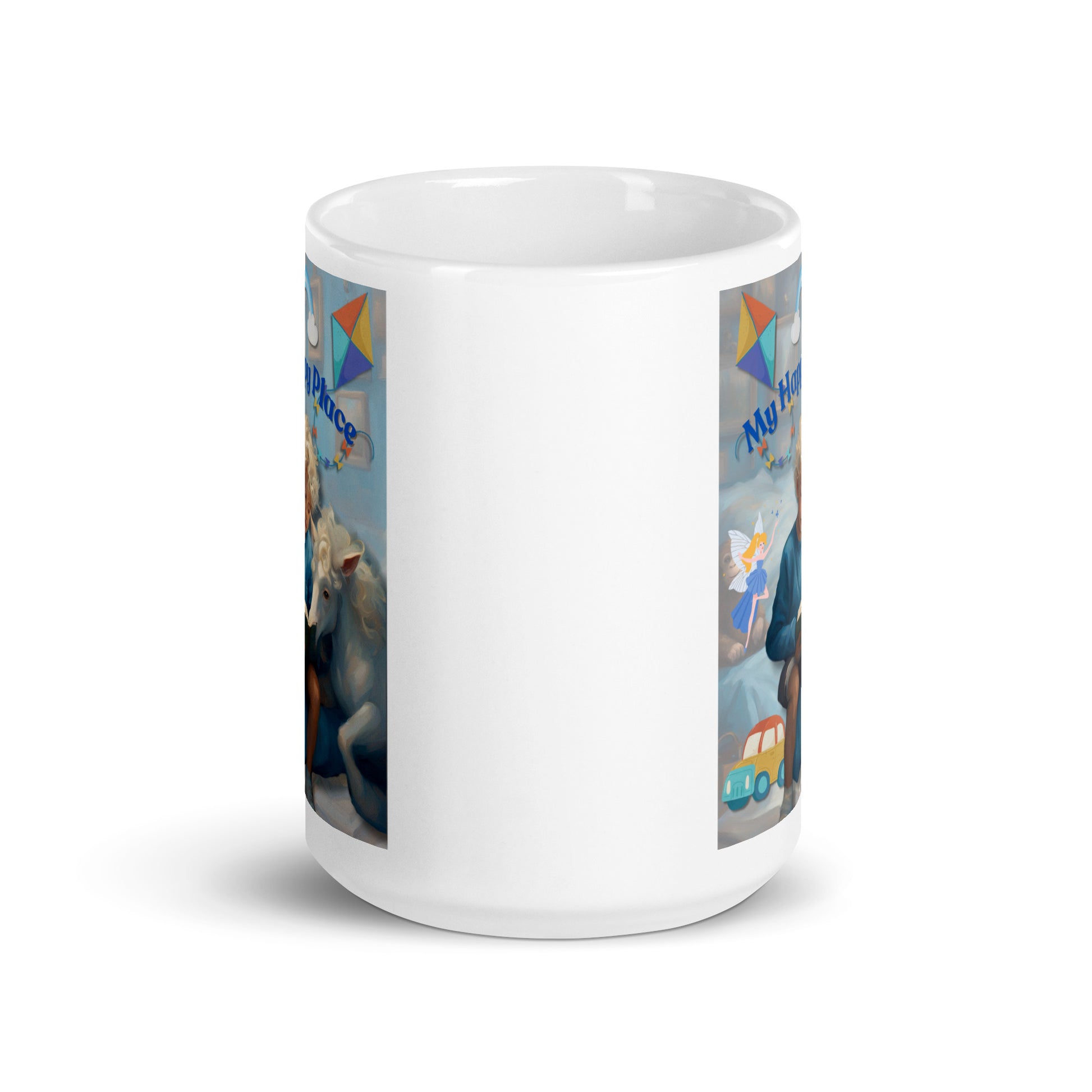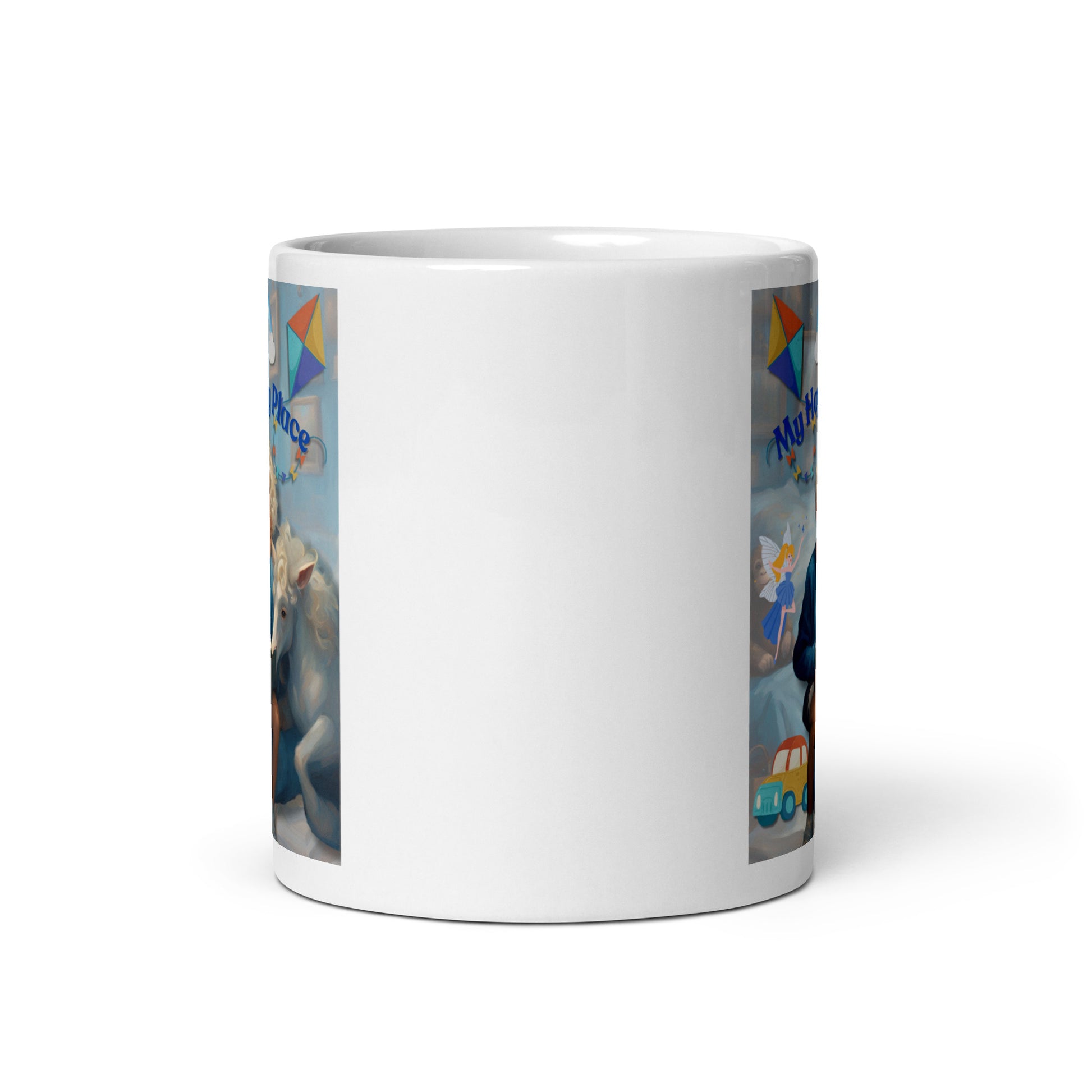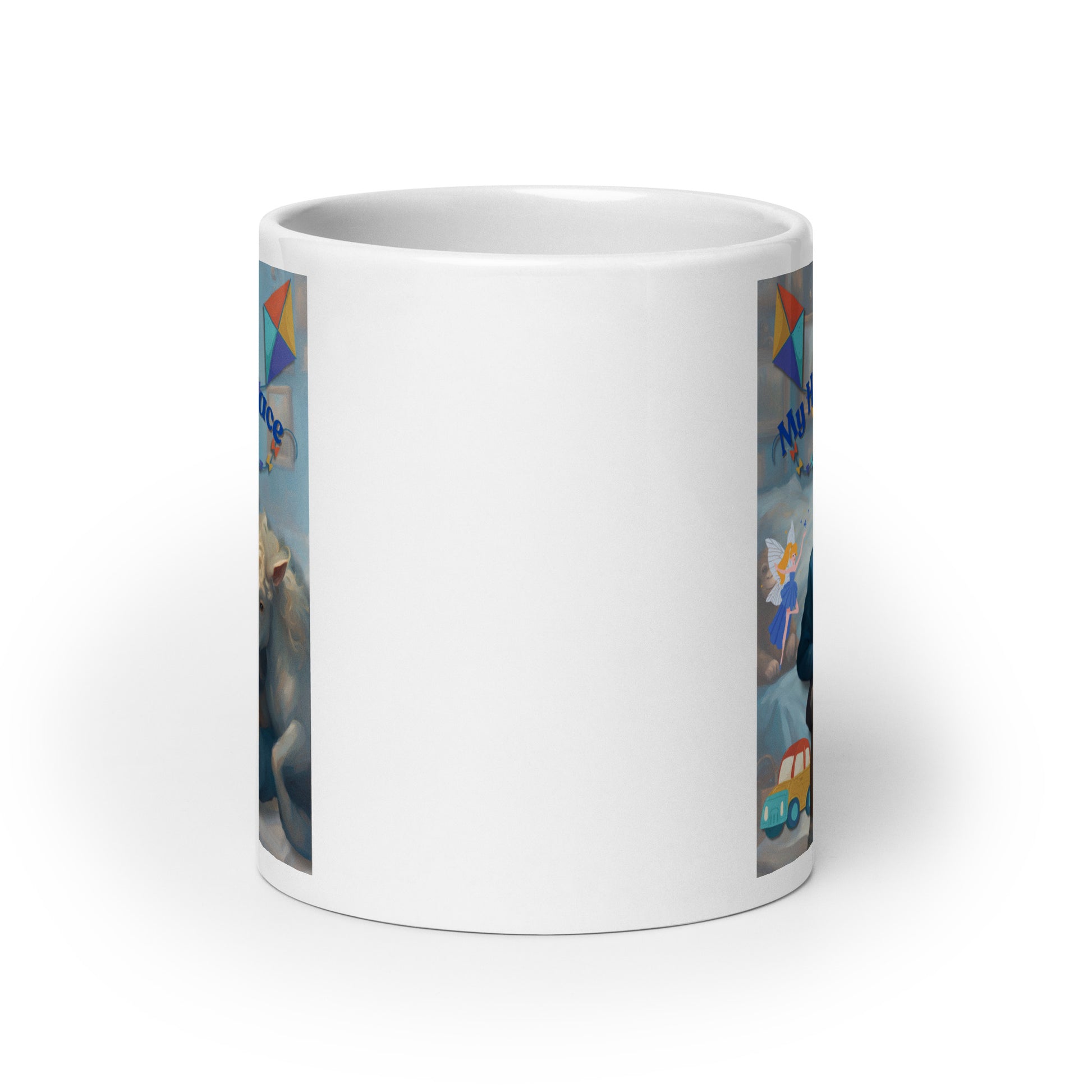 'My Happy Place' child's white glossy mug with blue impressionist oil style artwork