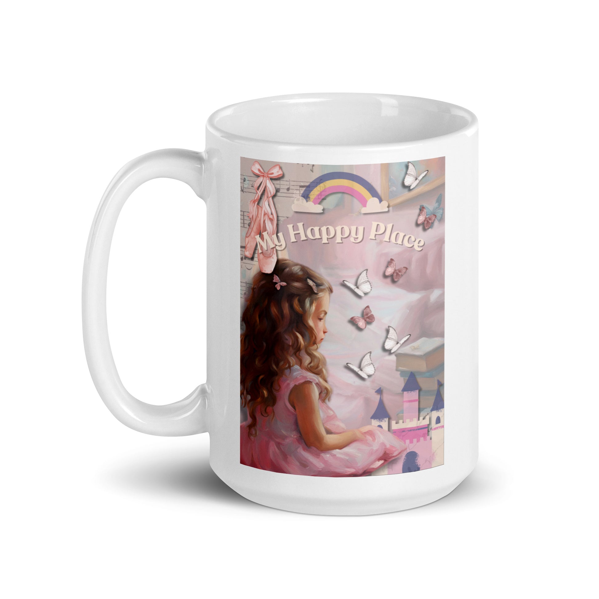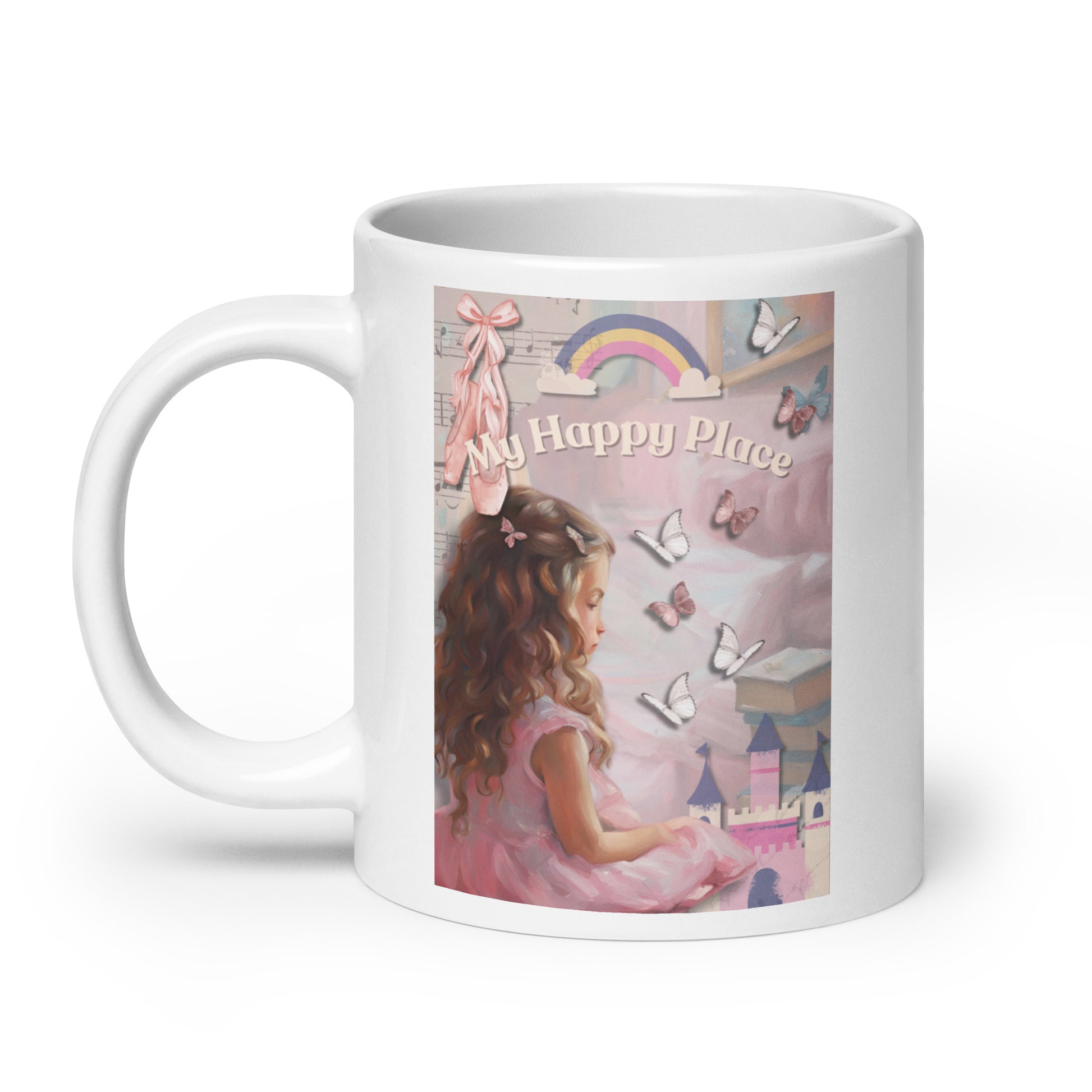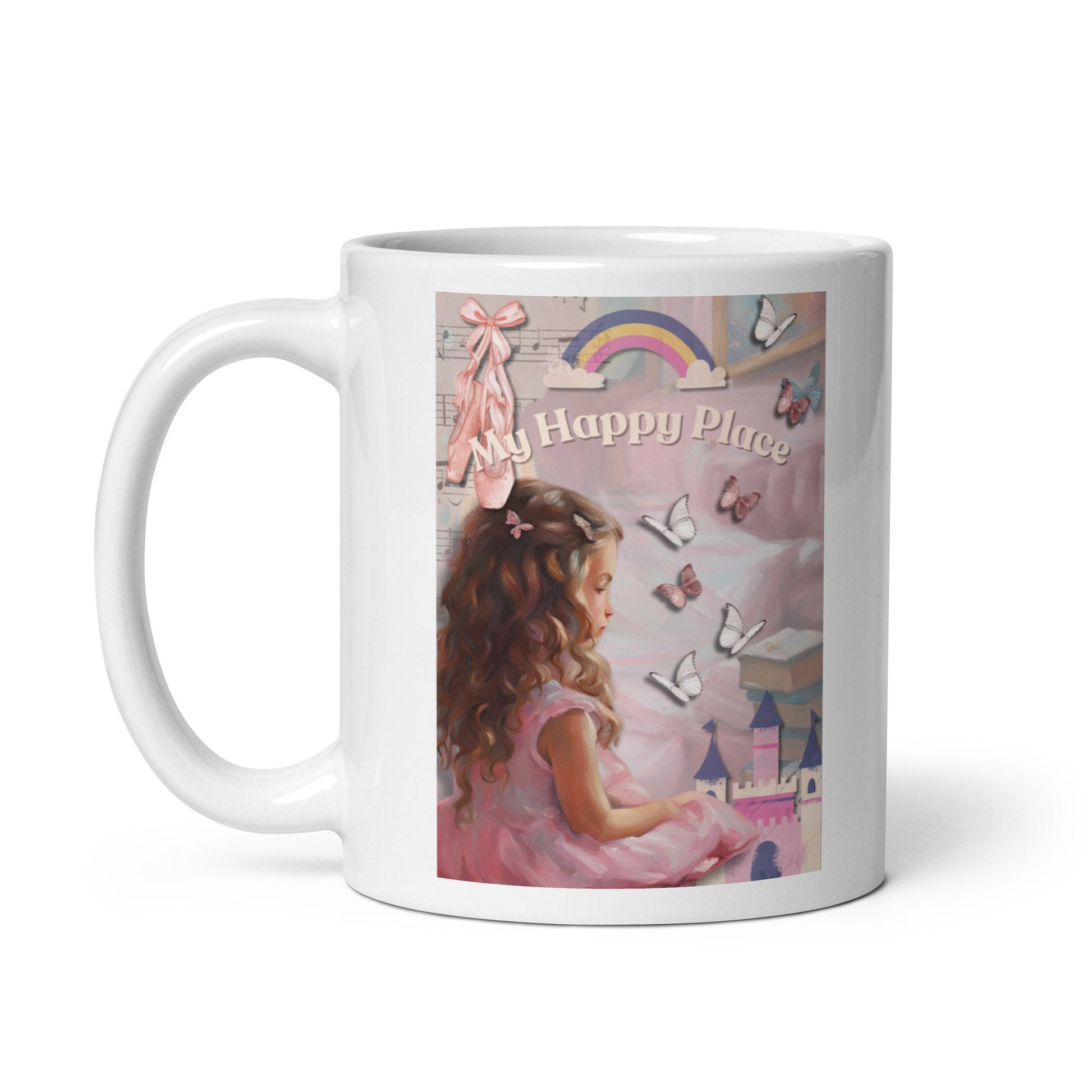 'My Happy Place' white glossy mug with pink impressionist oil style artwork