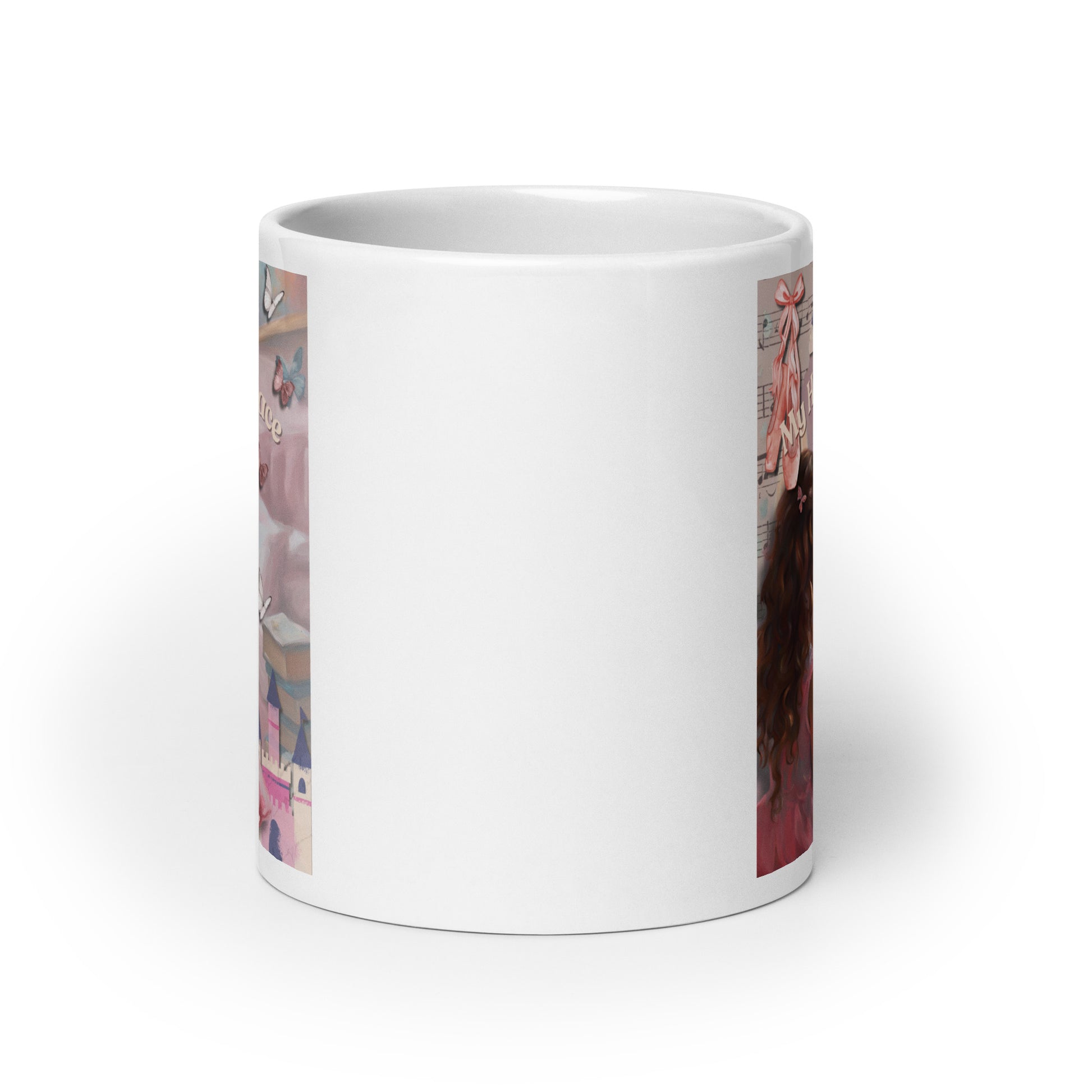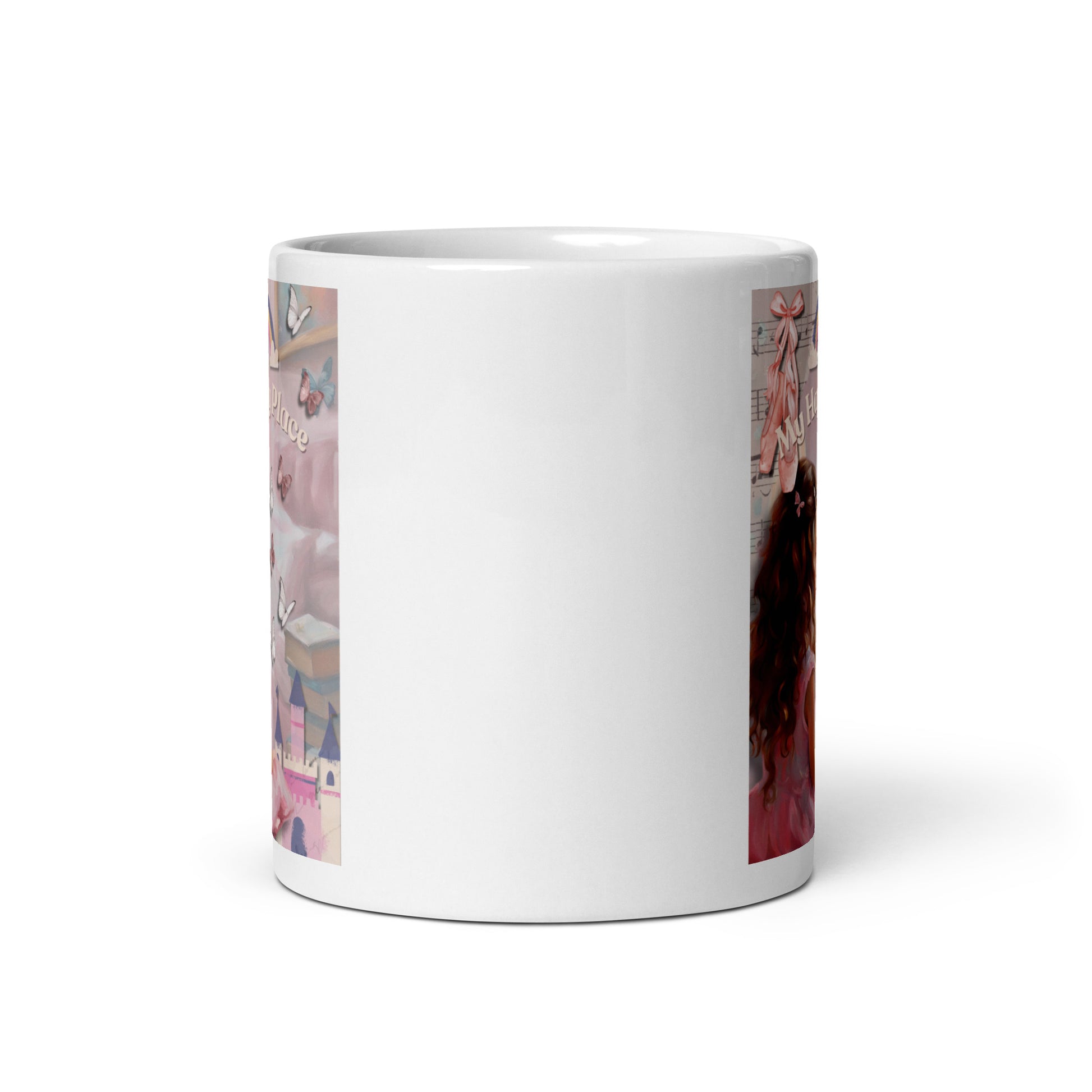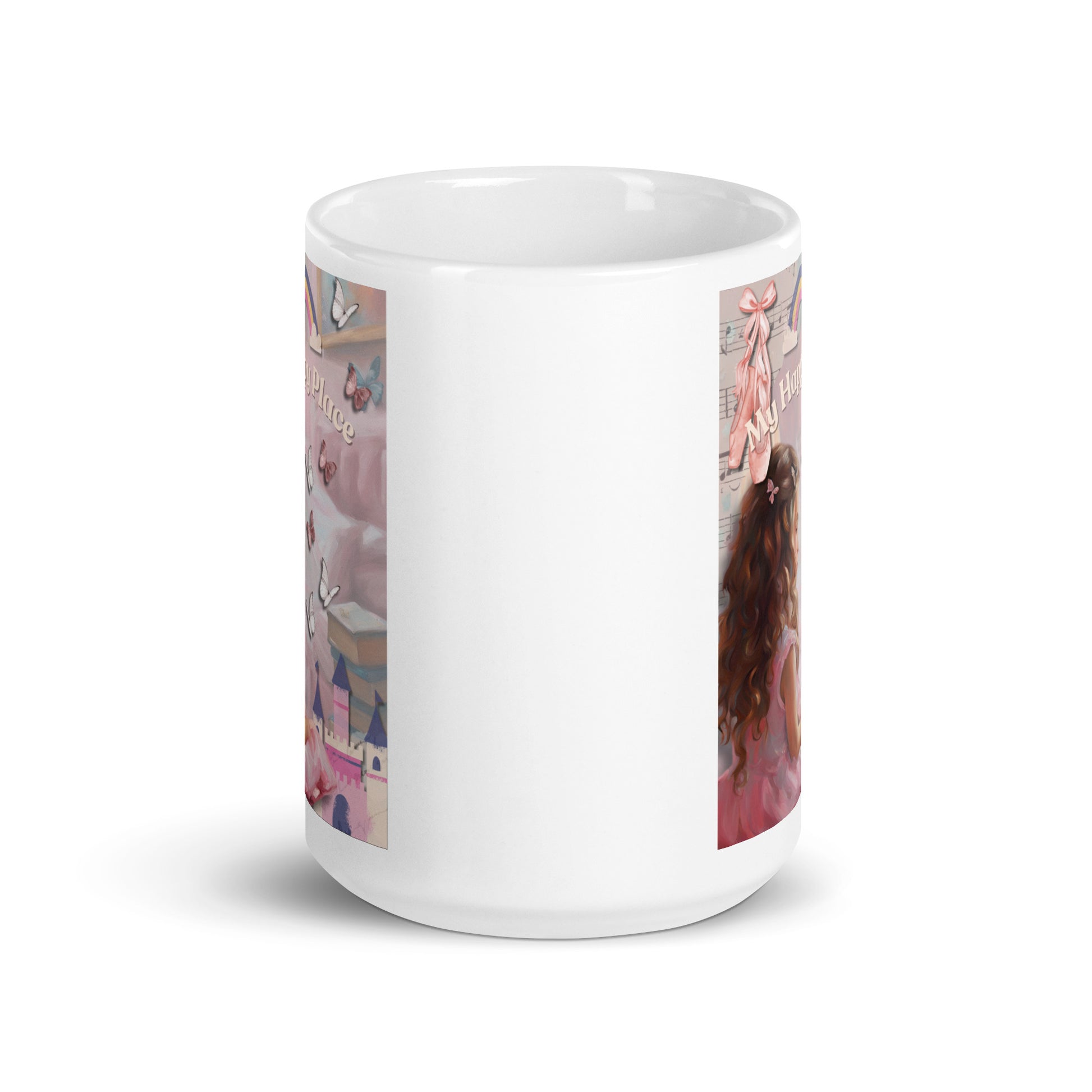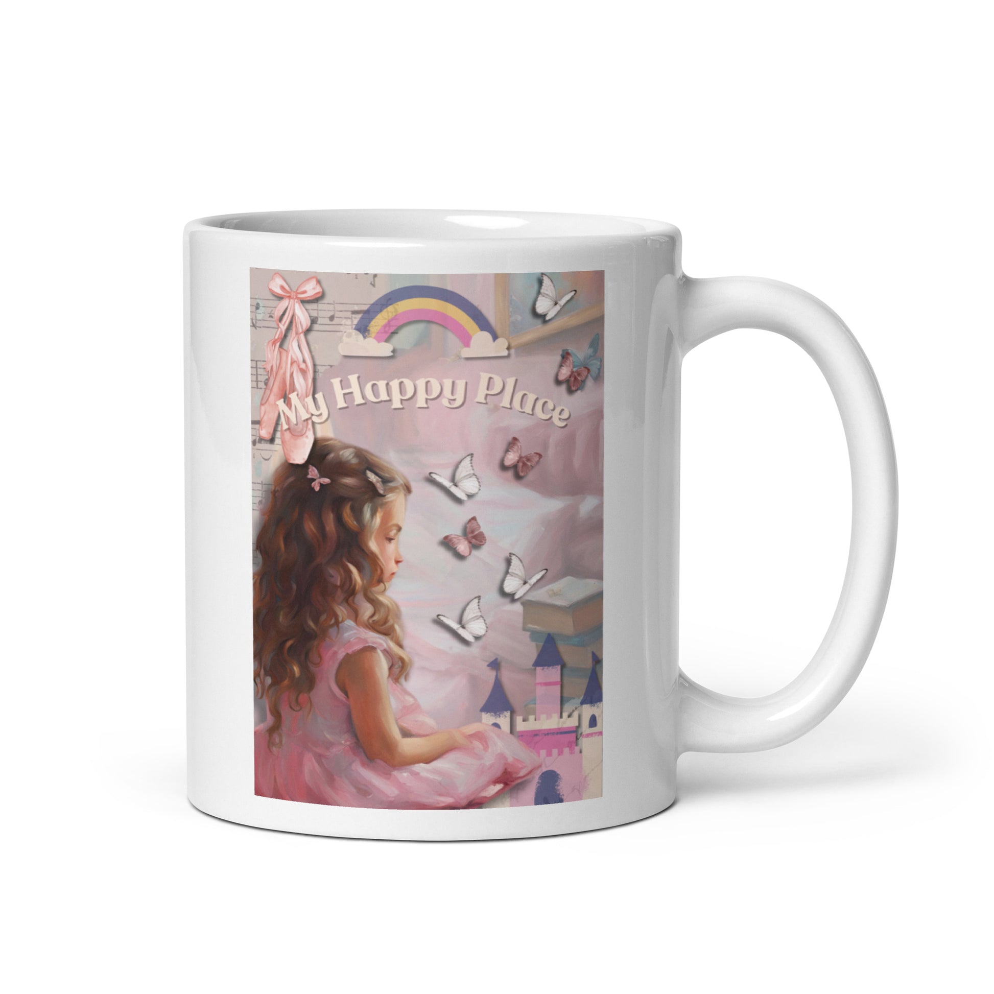 'My Happy Place' white glossy mug with pink impressionist oil style artwork
