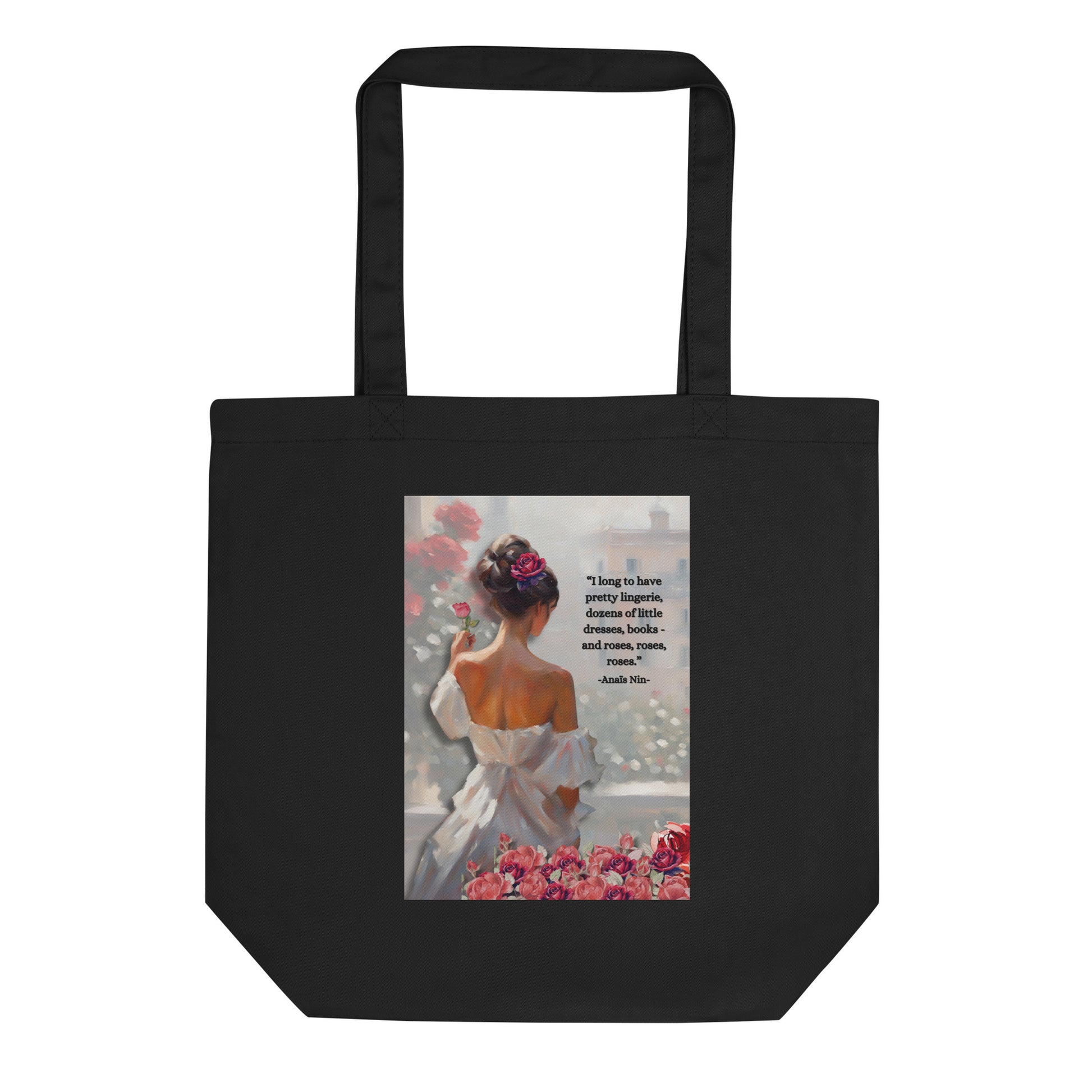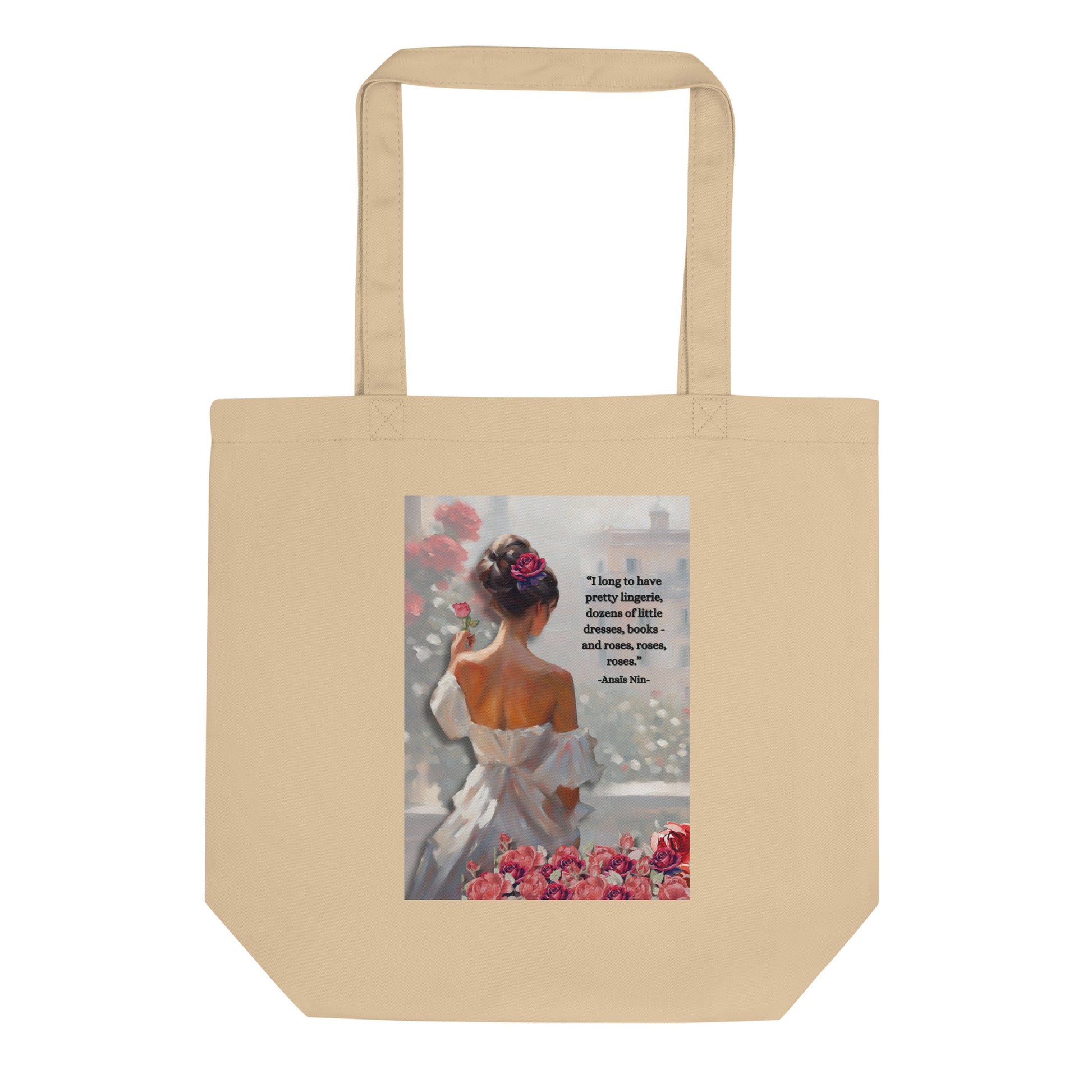 'Roses' eco tote bag with impressionist oil style artwork and quote from diarist Anaïs Nin