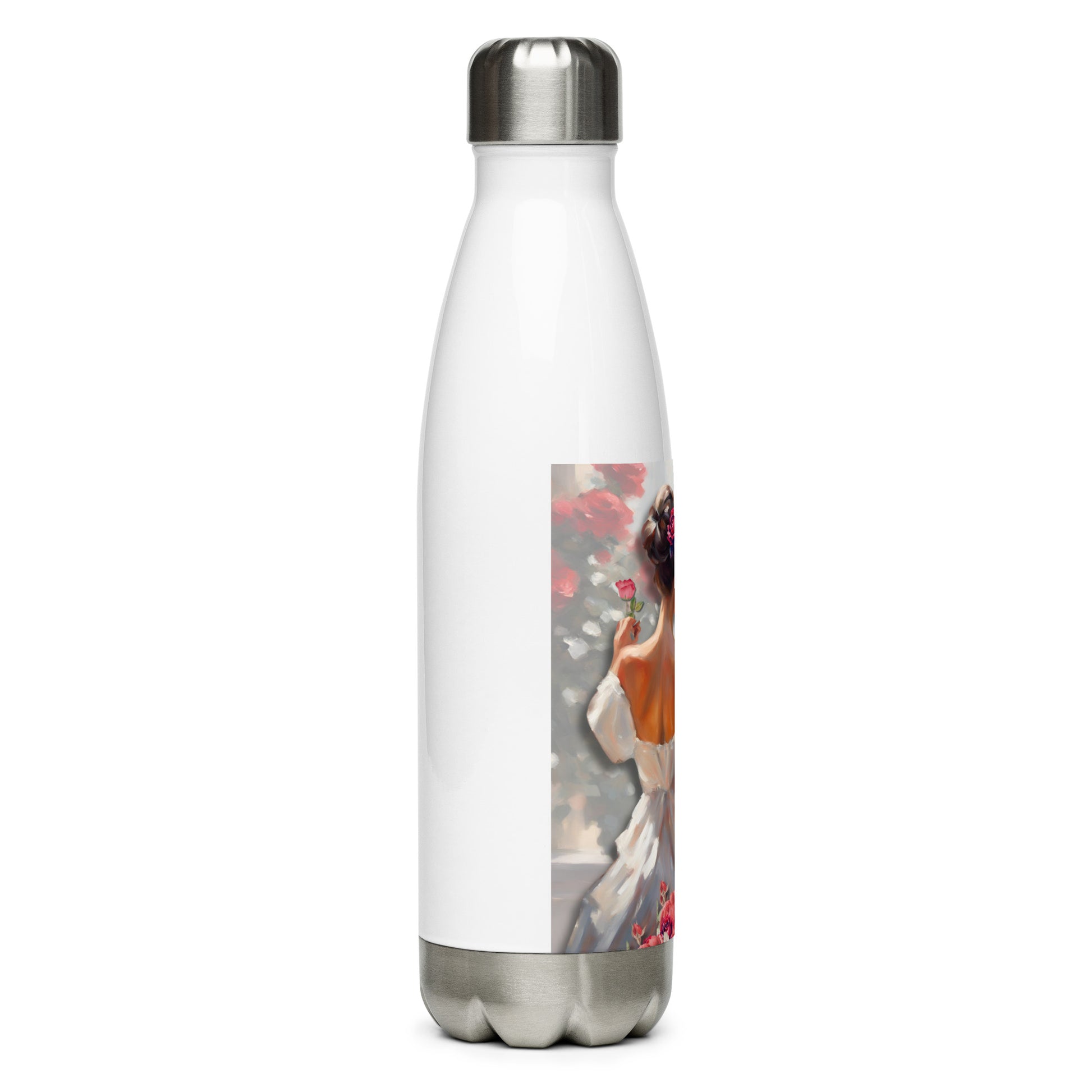 'Roses' stainless steel water bottle with impressionist oil style artwork and quote by diarist Anaïs Nin