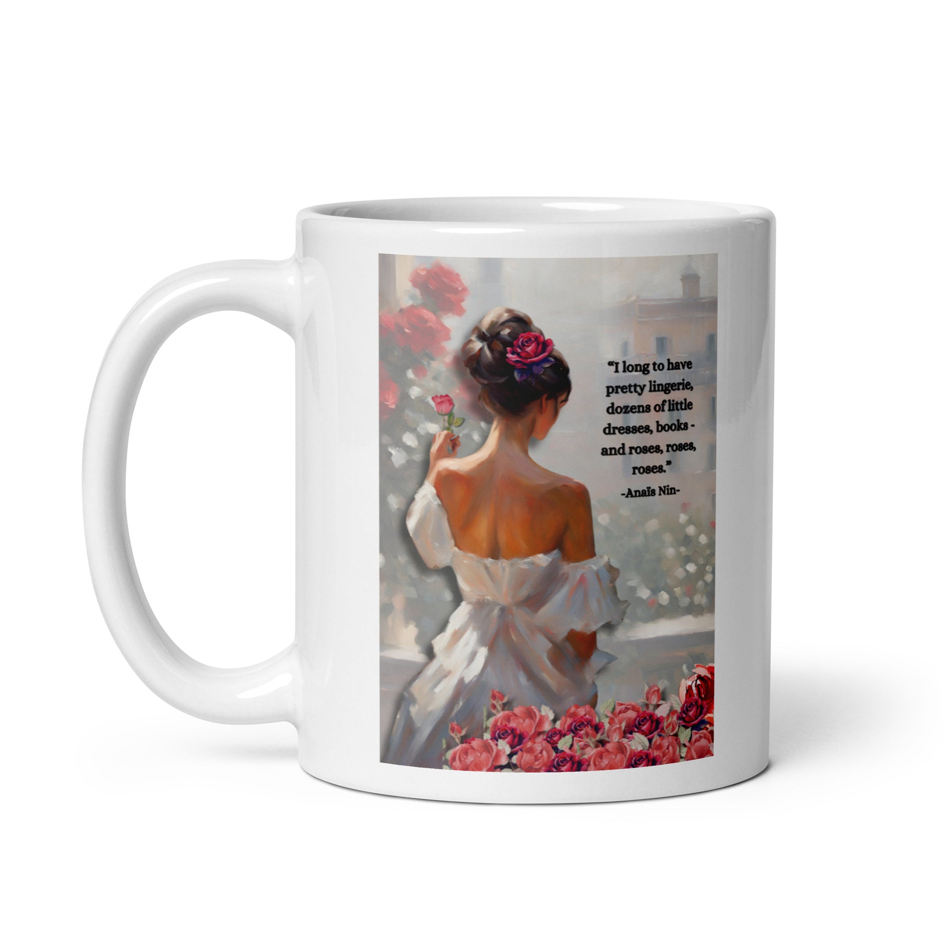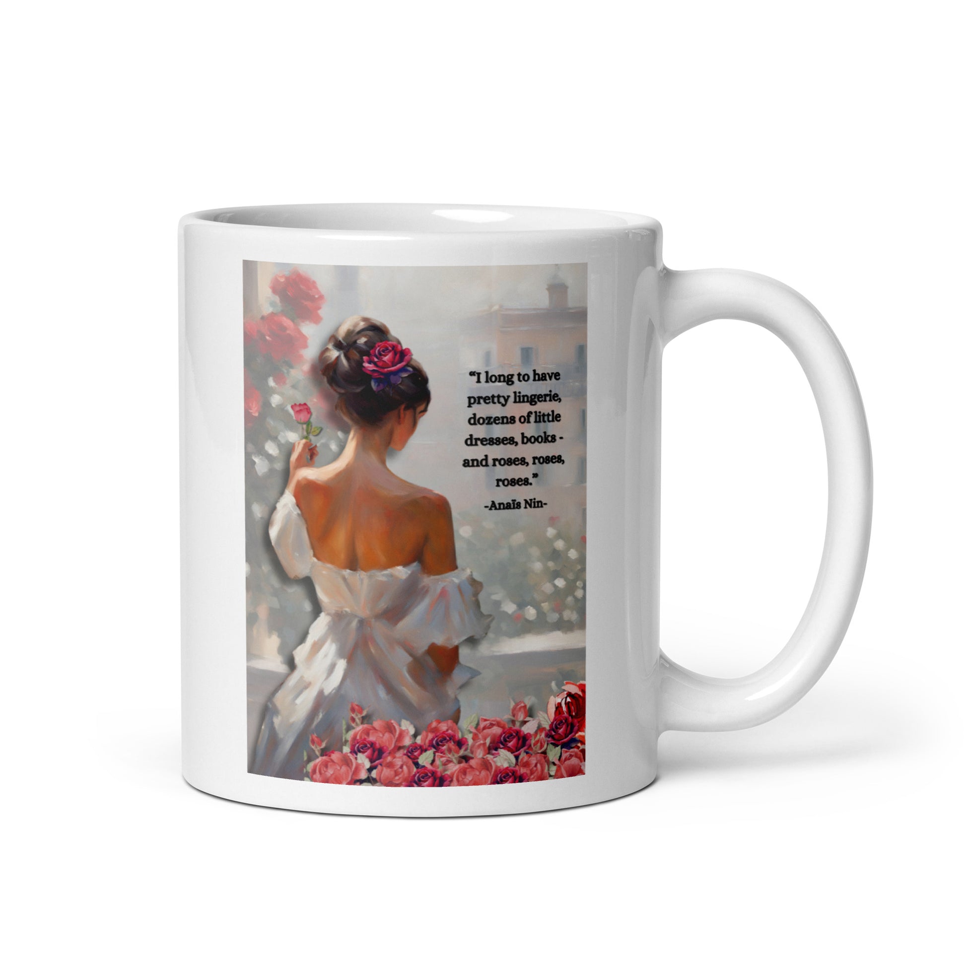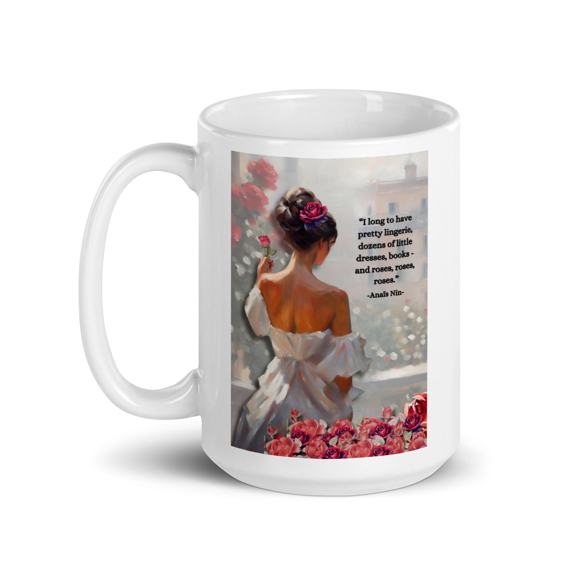 'Roses' white glossy mug with impressionist style artwork and quote by diarist Anaïs Nin