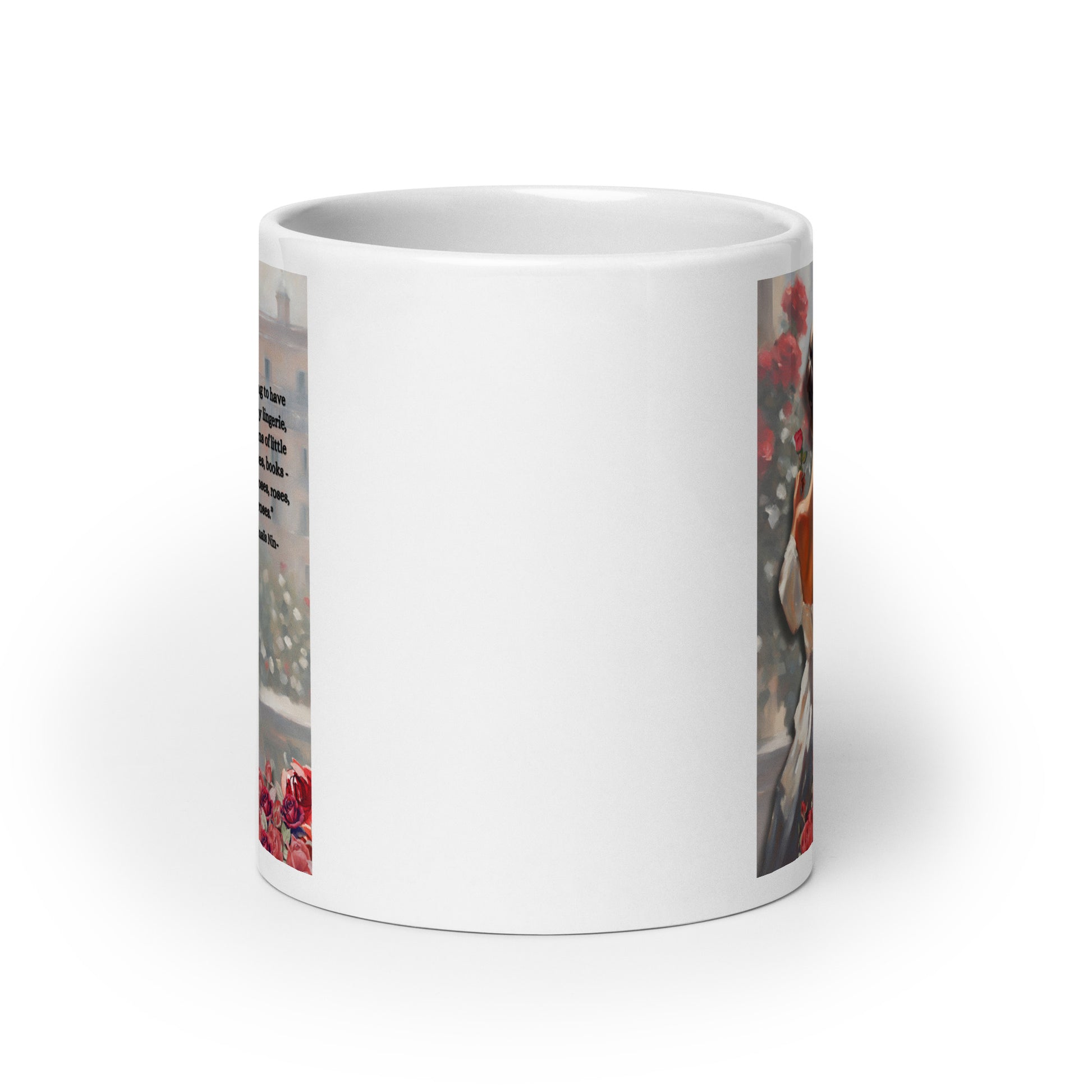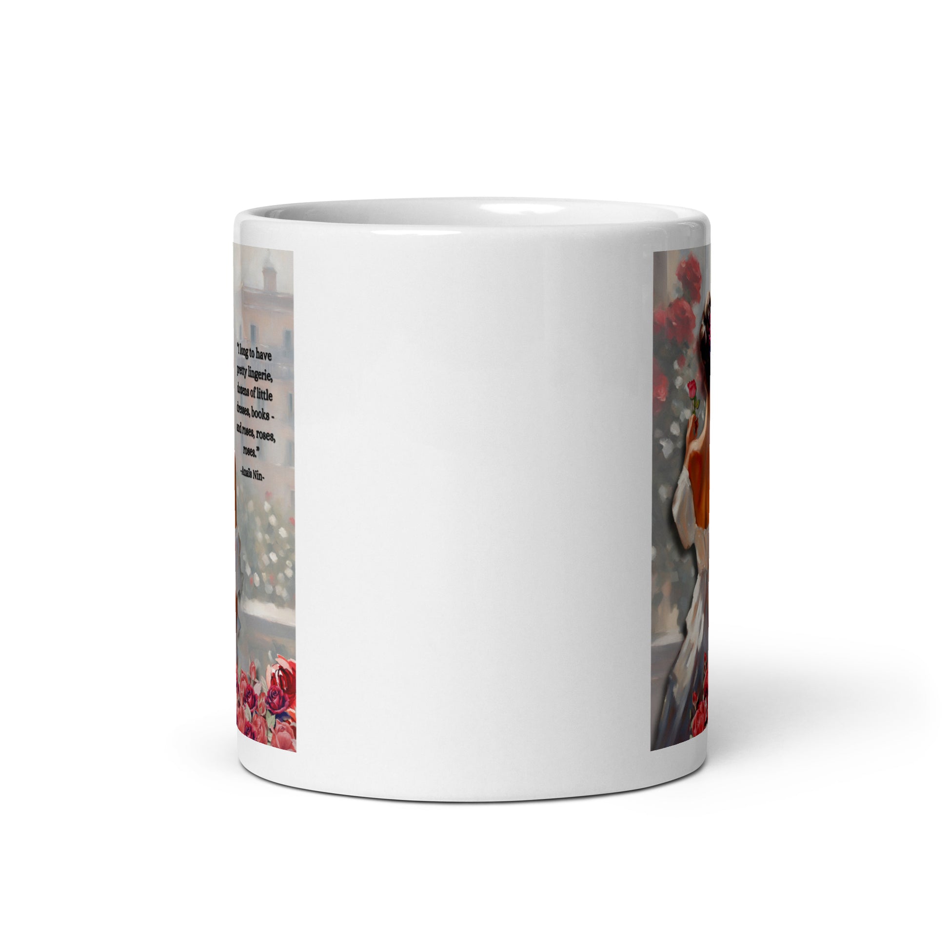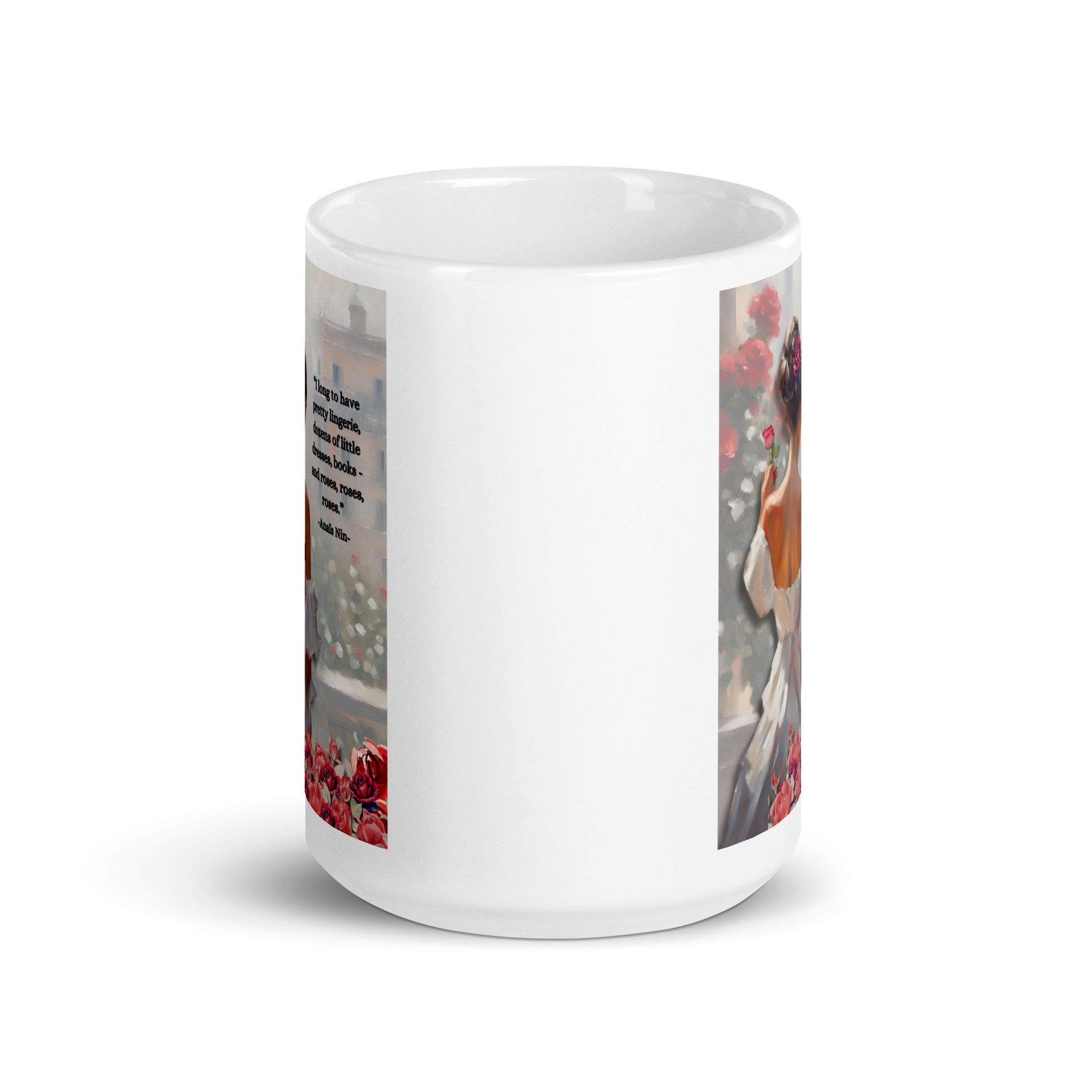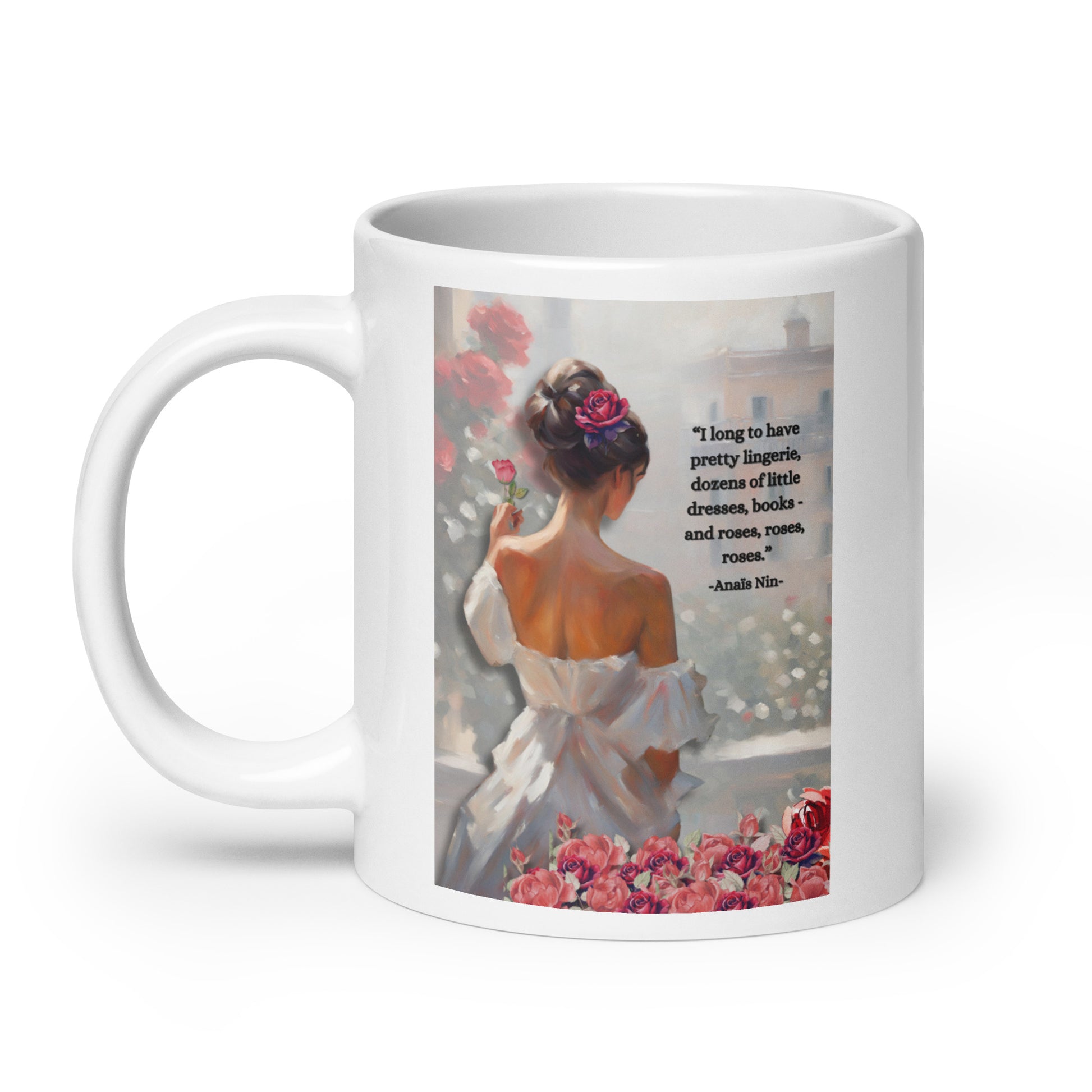 'Roses' white glossy mug with impressionist style artwork and quote by diarist Anaïs Nin