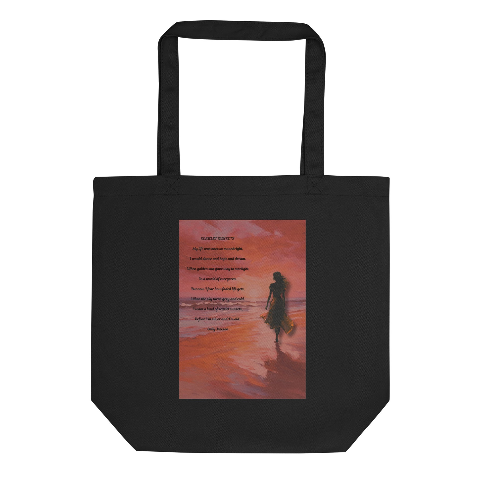 'Scarlet Sunsets' eco tote bag with impressionist oil style artwork and original poem by writer Sally Meeson