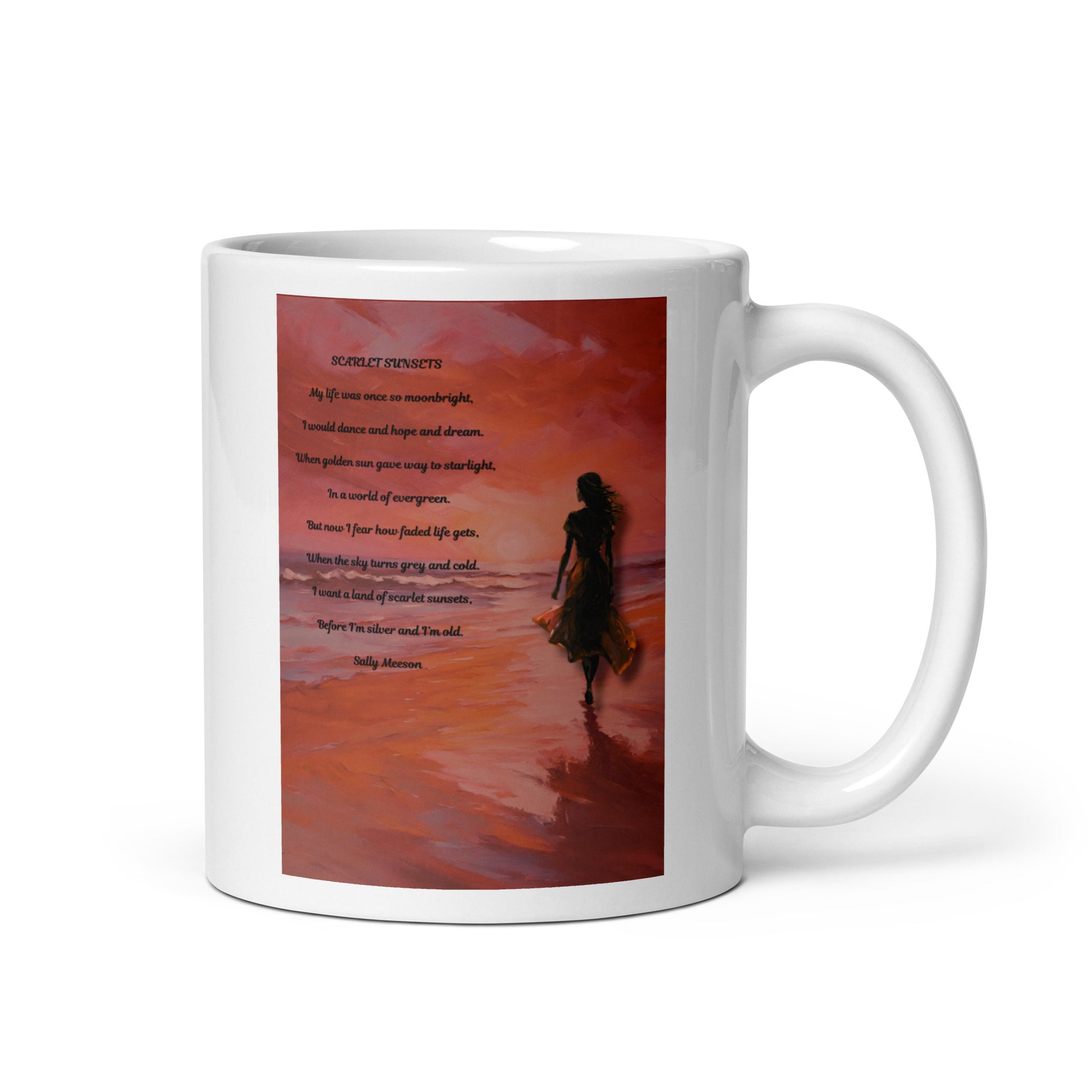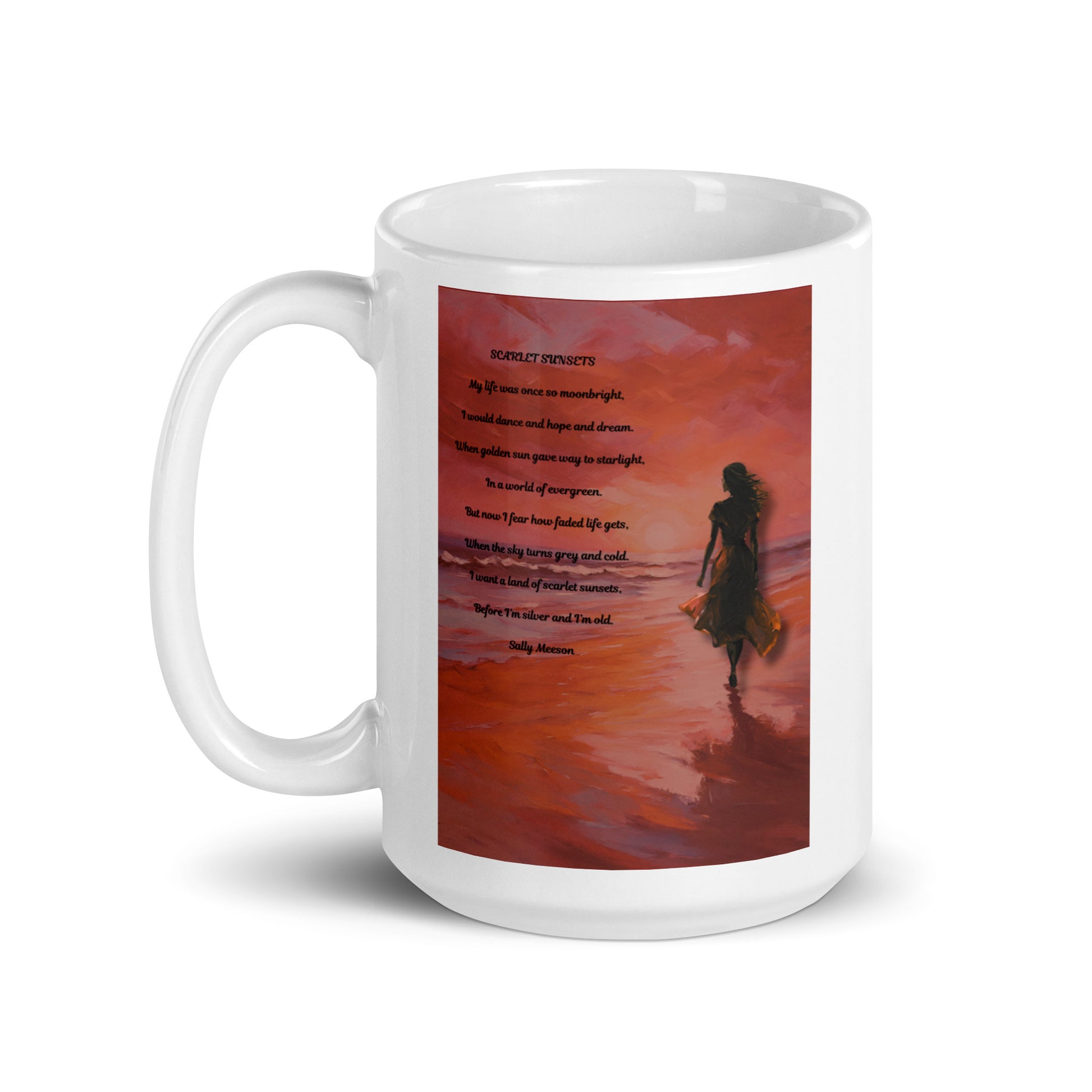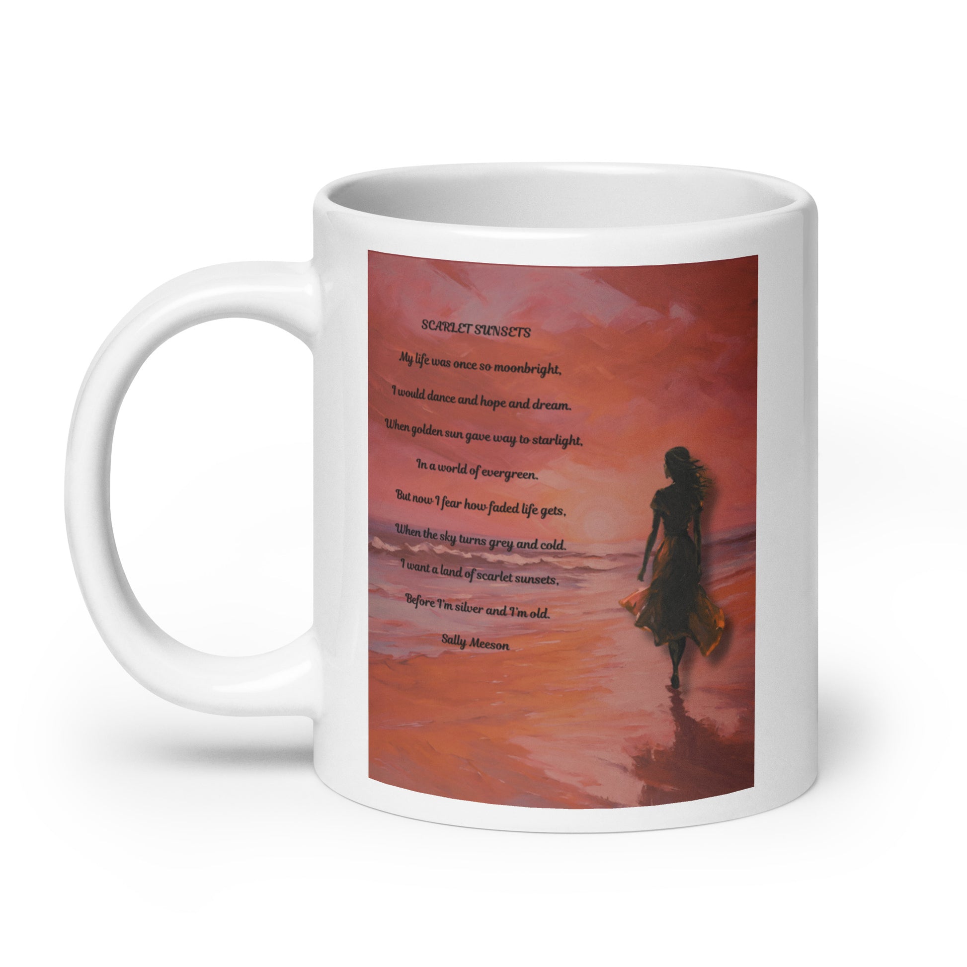 'Scarlet Sunsets' white glossy mug with impressionist style artwork and original poem by writer Sally Meeson