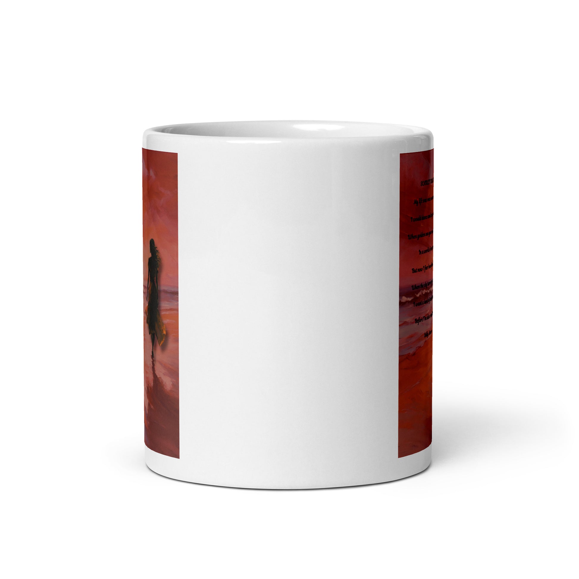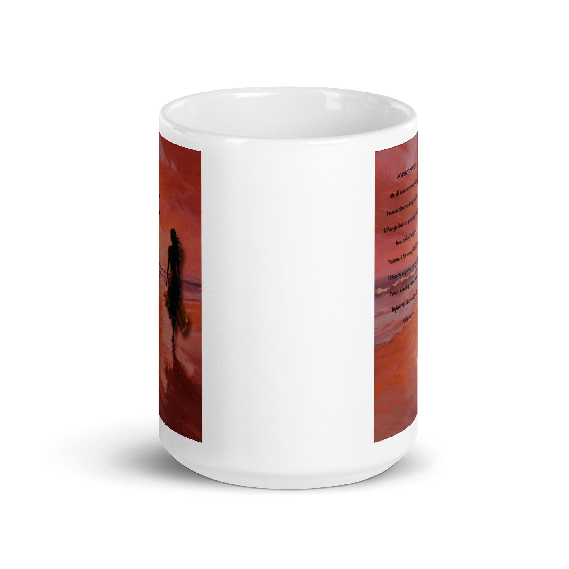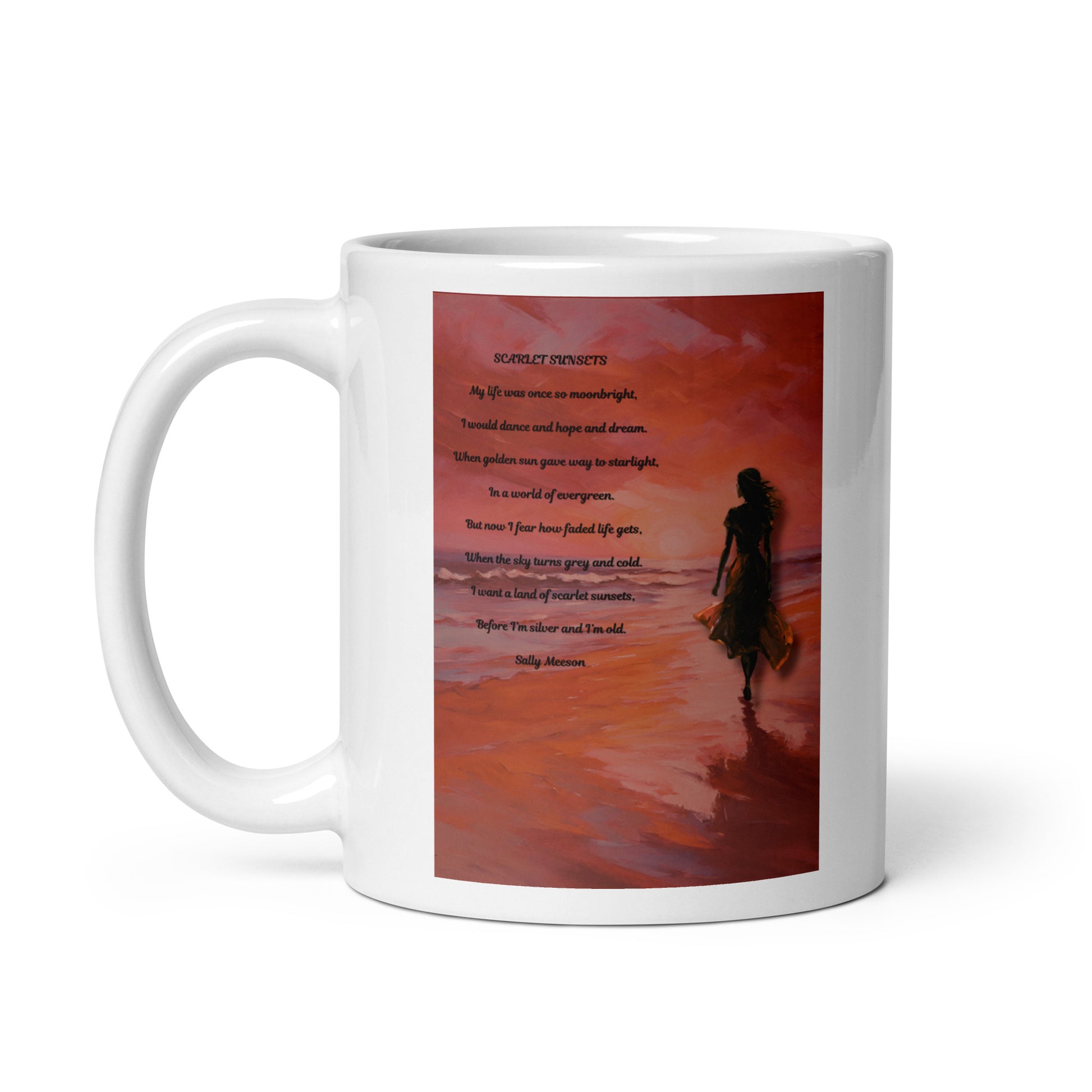 'Scarlet Sunsets' white glossy mug with impressionist style artwork and original poem by writer Sally Meeson