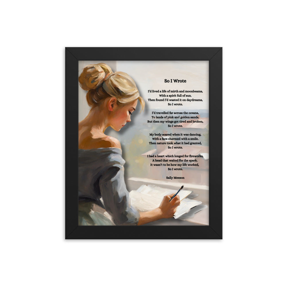 'So I Wrote' framed photo paper poster with impressionist oil style art work and original poem by writer Sally Meeson