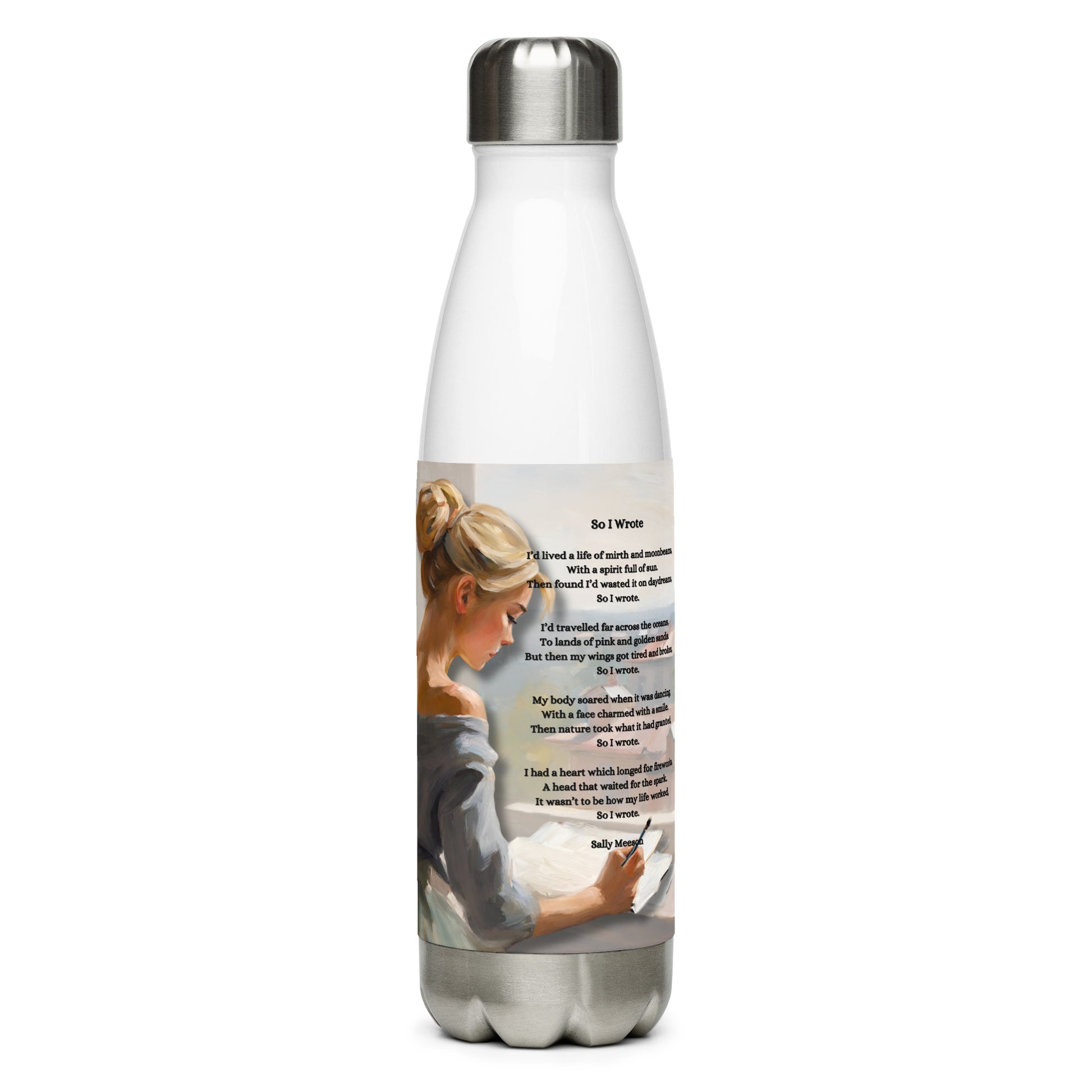 'So I Wrote' stainless steel water bottle with impressionist style artwork and original poem by writer Sally Meeson