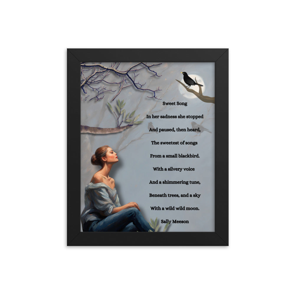 'Sweet Song' framed photo paper poster with impressionist style artwork and original poem by writer Sally Meeson