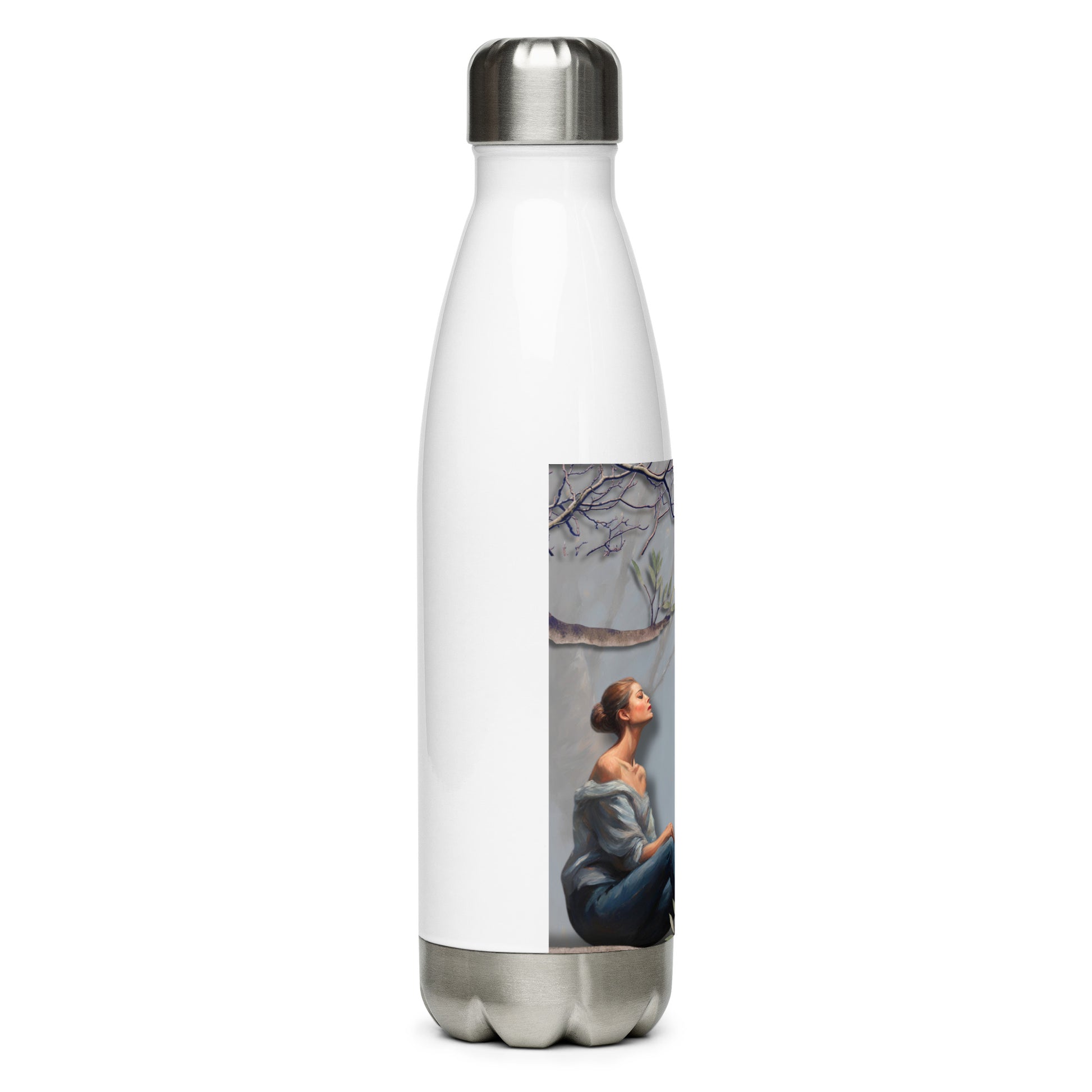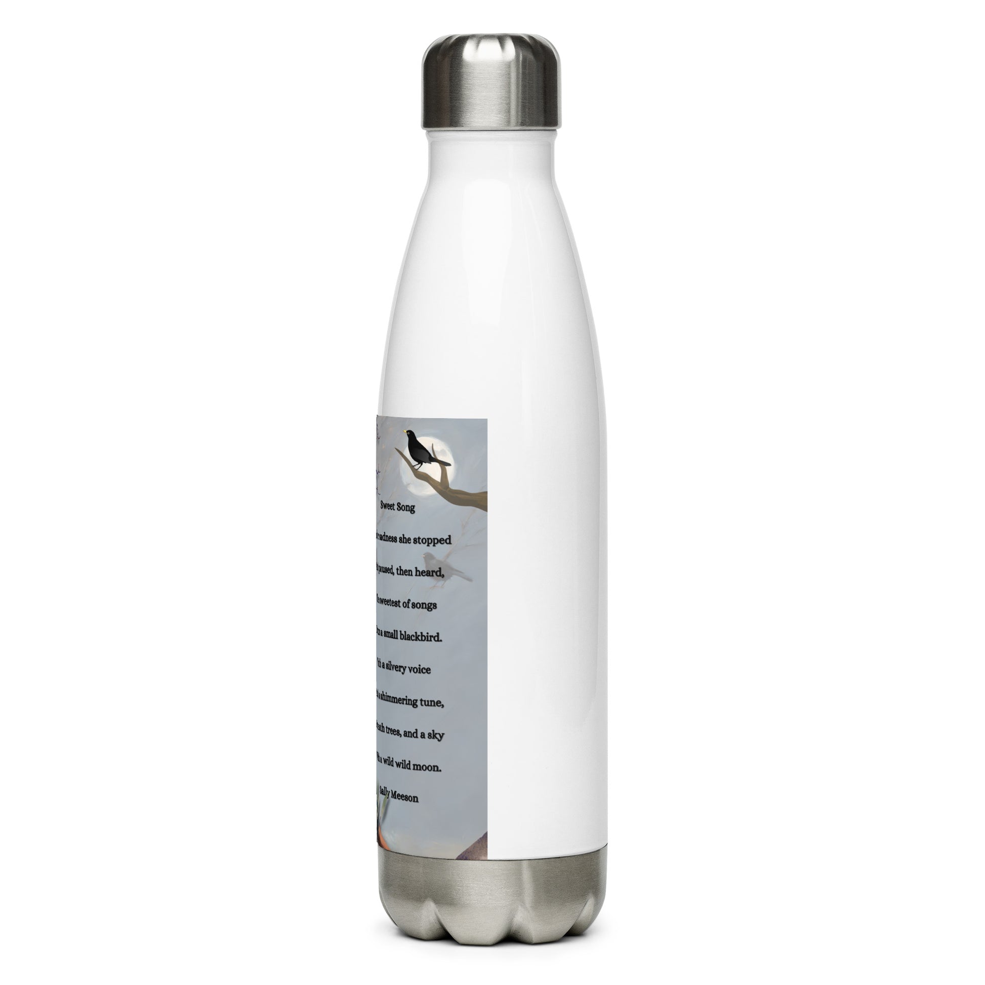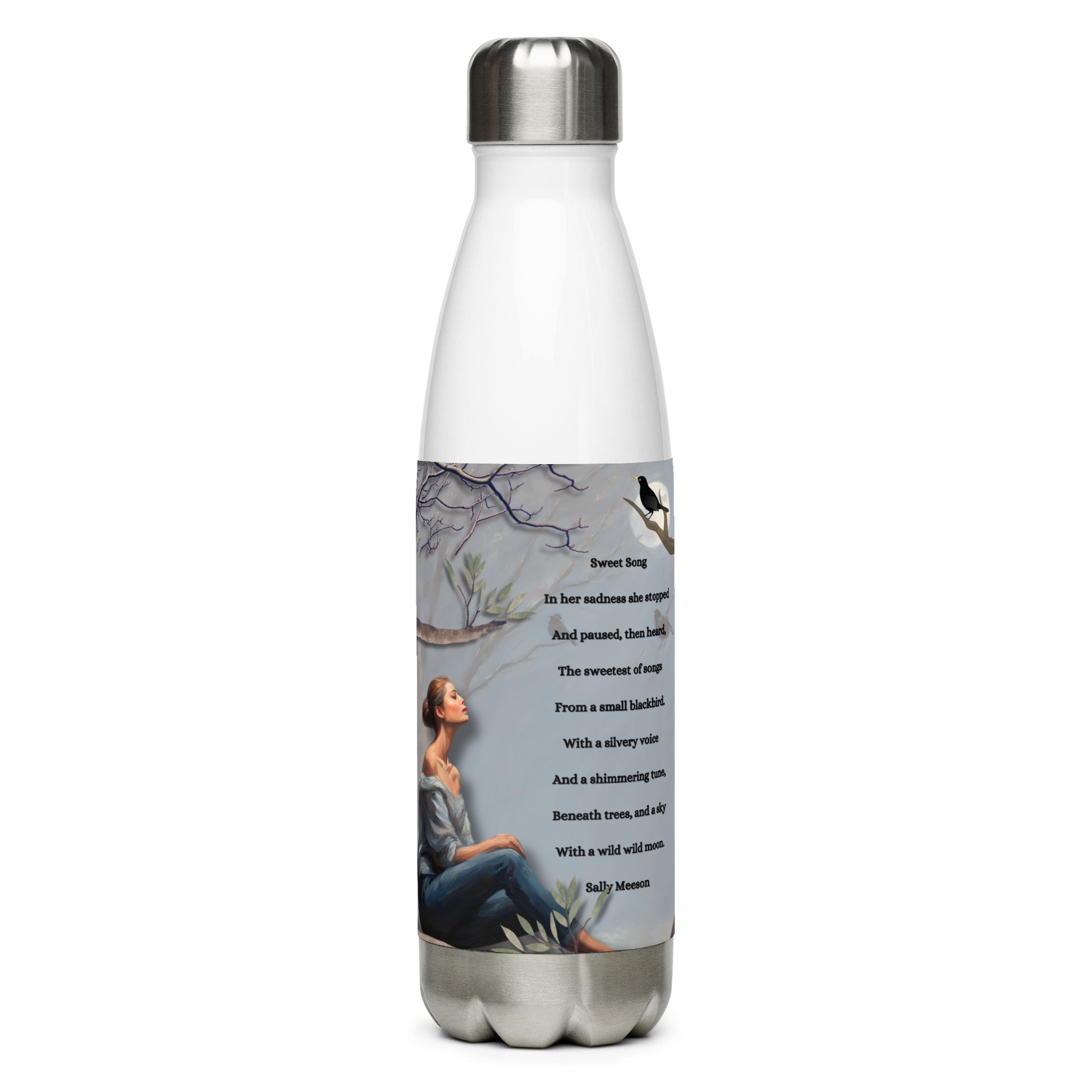 'Sweet Song' stainless steel water bottle with impressionist oil style artwork and original poem by writer Sally Meeson