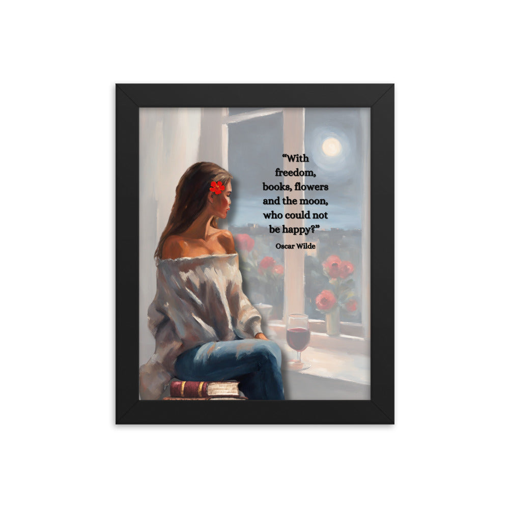'Freedom, books, flowers and the moon' framed photo paper poster with impressionist oil style artwork and Oscar Wilde quote